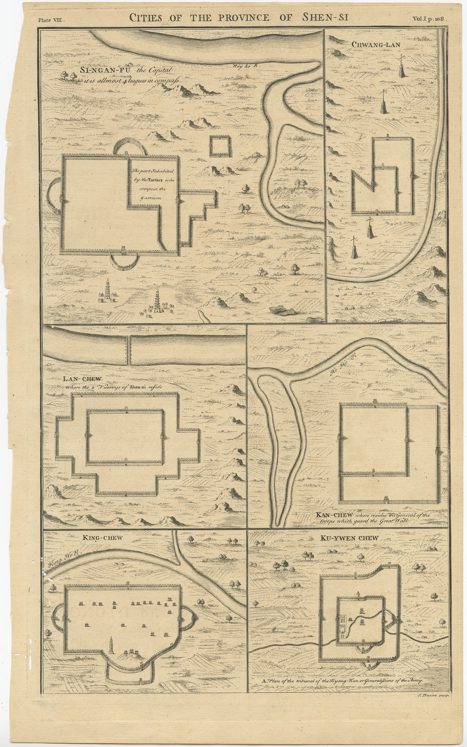 Antique Map of the Cities of the Province of Shen-Si by Basire (1738) $ 239.50 Availability: in stock Condition : Good, general age-related toning. Few marginal defects and worm holes (slightly affecting image), please study image carefully. Date : 1738 Overall size : 24 x 39 cm. Image size : 22 x 35 cm. Description: Antique print titled 'Cities of the Province of Shen-Si'. Old map depicting four walled cities of the Chinese Qing dynasty province of Shen-si (modern day SHAANXI): Si-ngan-fu, Chwang-lan, Lan-chew, Kan-chew, Ing-chew and Ku-ywen Chew. Originates from 'A description of the Empire of China and Chinese-Tartary' by J.B. du Halde. Du Halde's work inspired great interest in China among Europeans, and was a ground breaking work in geography. Artists and Engravers: Engraved by J. Basire. Published by E. Cave, London. |