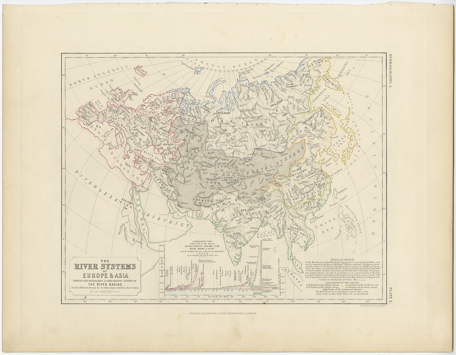 Antique Map of the River Systems of Europe and Asia by Johnston (c.1850) $ 127.69 instead of Availability: in stock Condition : Very good, general age-related toning. Please study image carefully. Date : c.1850 Overall size : 36 x 28 cm. Image size : 26 x 20 cm. Description: Antique map titled 'The River Systems of Europe & Asia'. Old map depicting the river systems of Europe and Asia showing the boundaries & comparative extent of the river basins, and the different oceans. Originates from 'The Physical Atlas of Natural Phenomena'. Artists and Engravers: Published by William Blackwood & Sons. |