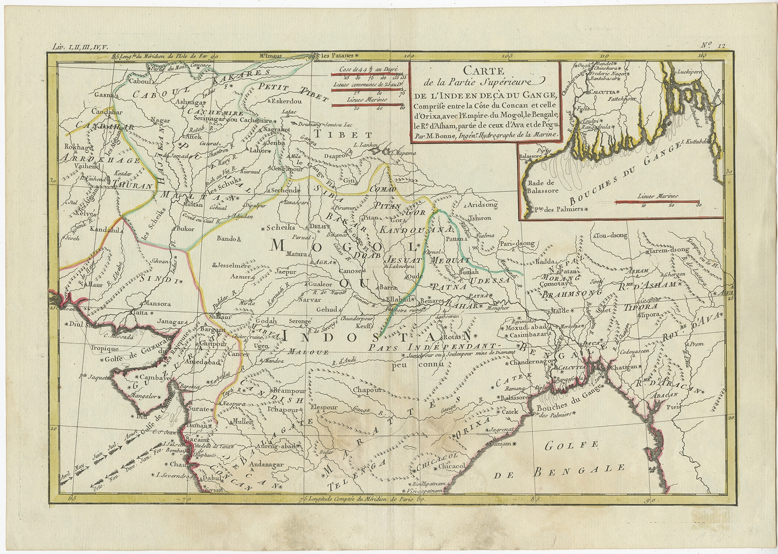 Antique Map of Northern India by Bonne (1780) $ 152.38 Availability: in stock Condition : Fair, age-related toning. Defect and stain lower part of map. Please study image carefully. Date : 1780 Overall size : 36 x 25.5 cm. Image size : 32 x 21.5 cm. Description: Antique map titled 'Carte de la partie Supérieure de l'Inde (..)'. A fine example of Rigobert Bonne and Guilleme Raynal’s 1780 map of northern India. Covers the northern part of India from Kandahar (Candahar) and Kashmir (Cachemire) south as far as Decan. Includes the areas claimed by the Mogol Empire, as well as adjacent parts of Tibet and Nepal. Names countless cities and river ways, as well as wind directions and some undersea shoals and other dangers. An inset in the upper right quadrant details the Mouth of the Ganges River. Drawn by R. Bonne for G. Raynal’s Atlas de Toutes les Parties Connues du Globe Terrestre, Dressé pour l'Histoire Philosophique et Politique des Établissemens et du Commerce des Européens dans les Deux Indes Artists and Engravers: Rigobert Bonne, (1727 - 1795), was one of the most important cartographers of the late 18th century. He succeeded Jacques Nicolas Bellin as Royal Cartographer to France in the office of the Hydrographer at the French Depôt de la Marine. |