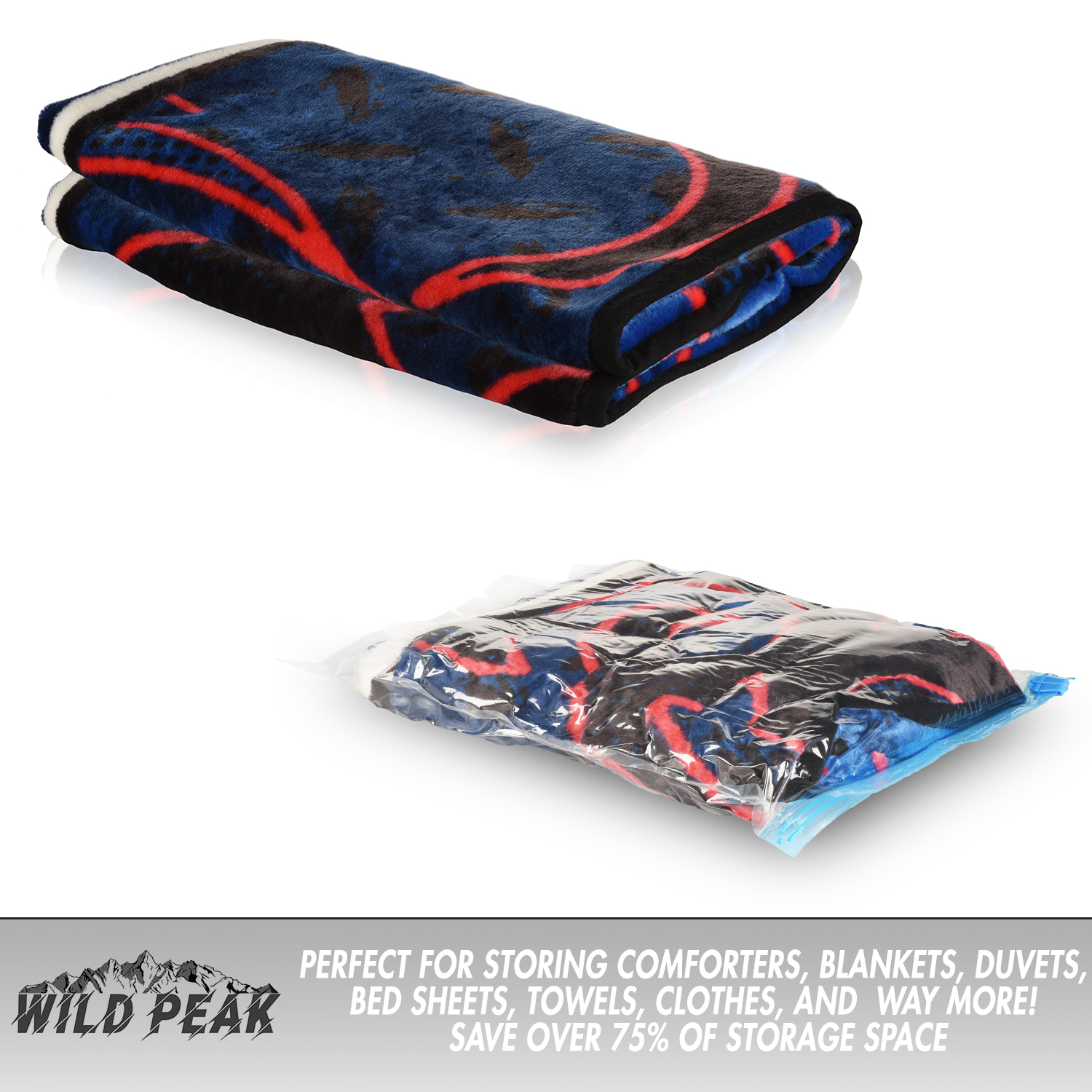 Is your closet overflowing with seasonal clothes, pillows or extra blankets? Pack more in less space with the Wild Peak Space Saver Reusable Compression Bags. Whether it’s for a business trip, family vacation, camping, or weekend get-away with friends, the storage bags safely compress and neatly contain all your valuable clothing and accessories. Bring everything you need without 80% of the bulk. The compression bags also work well for efficiently storing items around the home. Made with high quality BPA-Free materials, these airtight storage bags protect from dust, and keep everything fresh, clean and ready to use. It’s time to stop dreading your closets and start experiencing the relief of a beautiful, well organized space! They are perfect for anything from seasonal clothes and beach towels to comforters, bed linens, blankets, pillows, and more. They can even be used as dry bags to protect your wallet and other items while our hiking or camping. Designed with double-zip closures, the bags ensure an airtight seal. Simply pack, zip, and roll. No vacuum or pump is required. Rolling from the zipper end pushes all the air out through small one-way valves at the bottom of the bag. The air-free bag can remain rolled up in a tube-like shape, or it can be unrolled and laid out flat if preferred. Use them around your home to make the most of your closet and storage space by compressing winter clothes, bedding, and baby clothes or toys. With no pump or vacuum required, all you have to do is pack, zip, roll and compress for an airtight, waterproof and compact clothes storage solution.