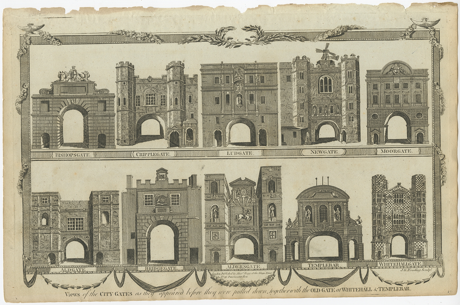 Antique Print of City Gates by Hogg (c.1800) $ 97.18 Availability: in stock Condition : Good. General age-related toning, some defects. Please study image carefully. Date : c.1800 Overall size : 38.2 x 24.7 cm. Image size : 36.3 x 22.1 cm. Description: Antique print titled 'Views of the City Gates (..)'. Old print with views of the city gates as they appeared before they were pulled down, together with the Old Gate at Whitehall & Templebar. Artists and Engravers: Published by A. Hogg. |
