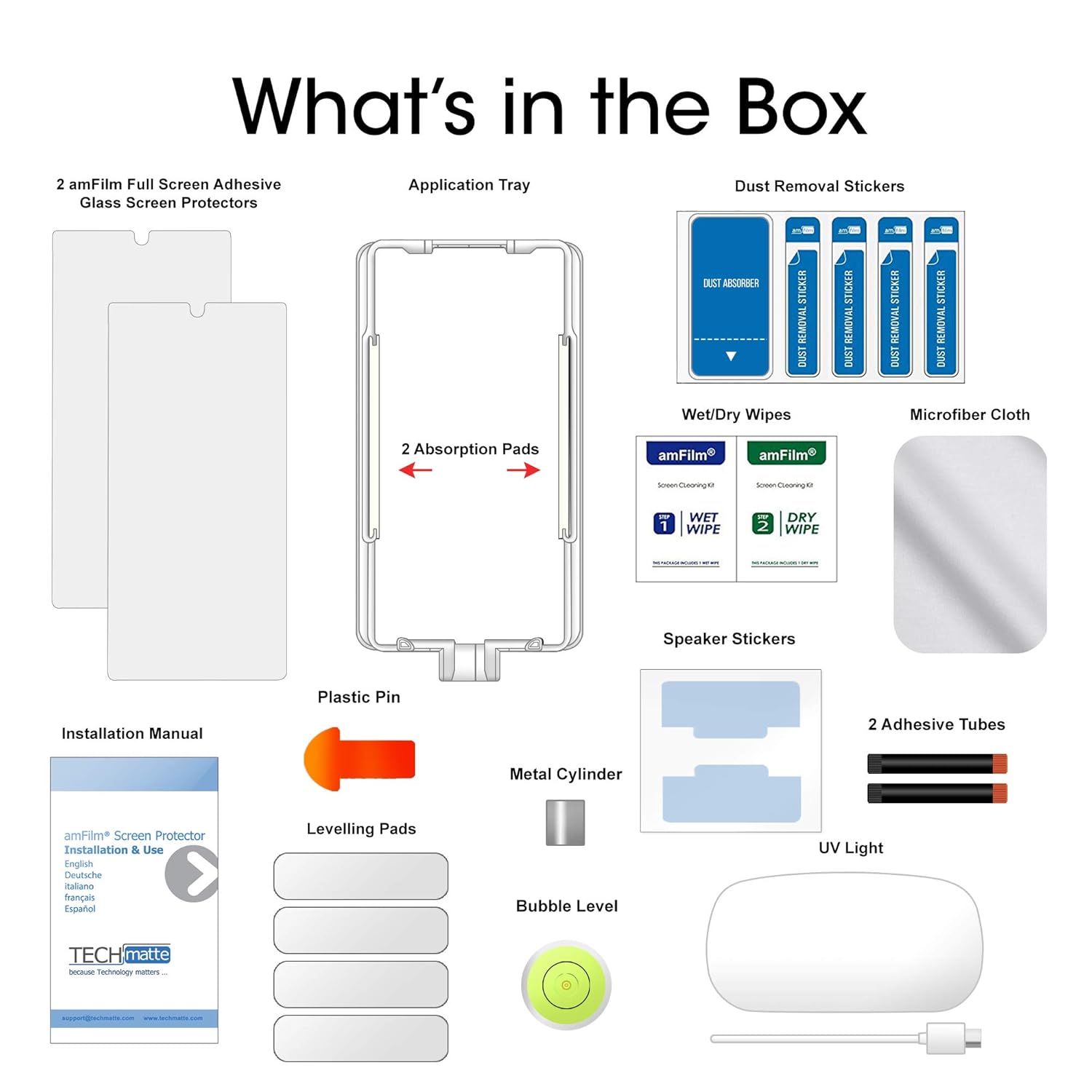 Includes: (2) Tempered Glass Screen Protectors, (1) Application Tray, (1) UV Light, (1) Wet/Dry Wipe, (1) Micro-Fiber Cleaning Cloth, (6) Dust Removal Stickers, (1) Sheet of Speaker Stickers, (1) Leveling Pad, (1) Metal Cylinder, (2) Absorption Pads, (2) Adhesive Tubes, (1) Plastic Pin, (1) Bubble Level, (1) Installation/User Guide