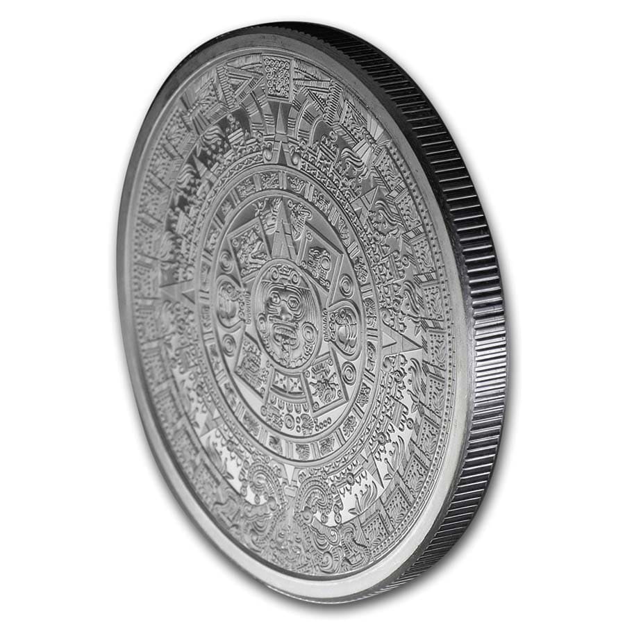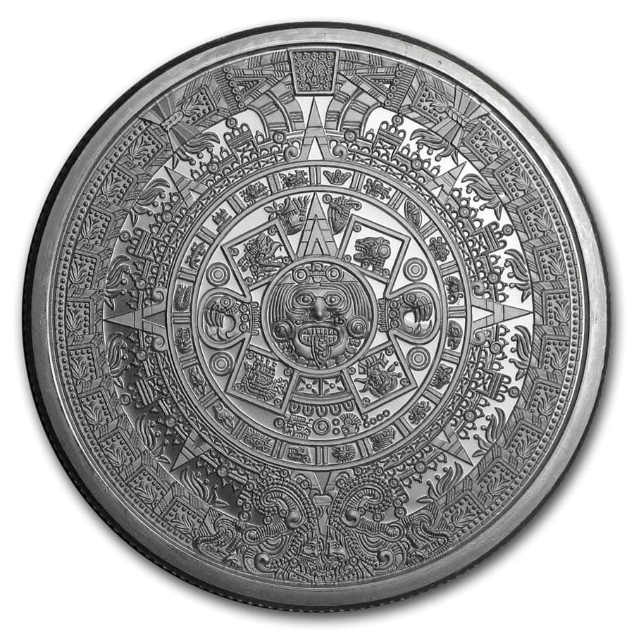 - Obverse: Depicts the famous Aztec Calendar stone. The design is in a circular shape resembling a sun, with rays emanating outward. In the center is the face of the Aztec solar deity, Tonatiuh, which gives the monolith its alternate name the Sun Stone.