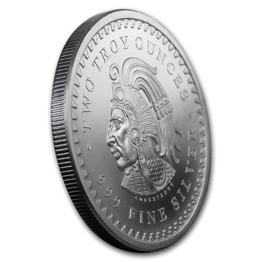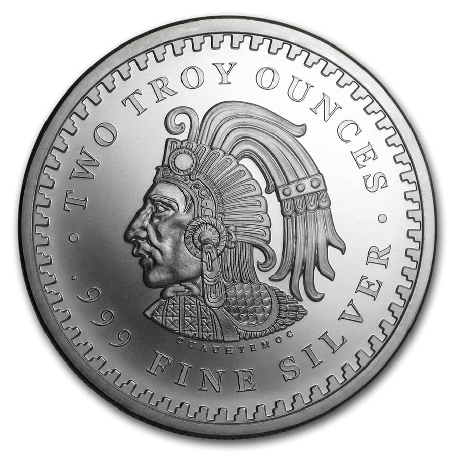 - Reverse: Depicts the striking left portrait of Cuauhtemoc, the last Aztec Emperor of Tenochtitlan. The name Cuauhtemoc means Descending Eagle, as in the moment when an eagle folds its wings and plummets down to strike its prey. He wears the traditional headdress and ear ornaments of the Aztec elite, and is surrounded by an Aztec border as well as the inscriptions of his name and the metal content, weight, and purity.