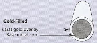 -Gold-filled jewelry, also known as "rolled gold" or "rolled gold plate" is composed of a solid layer of gold bonded with heat and pressure to a base metal such as brass.