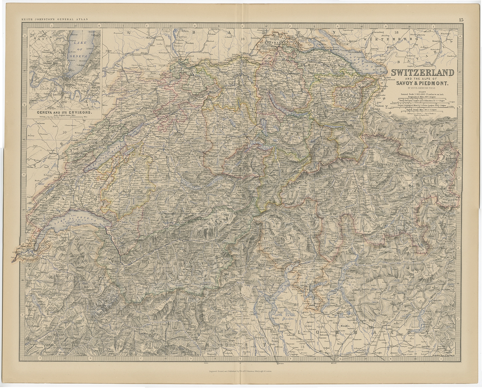Antique Map of Switzerland by Johnston (1882) $ 148.93 Availability: in stock Condition : Good, general age-related toning. Please study image carefully. Date : 1882 Overall size : 61.6 x 42.5 cm. Image size : 58.4 x 44.3 cm. Description: Antique map titled 'Switzerland and the Alps of Savoy and Piedmont'. Old map of Switzerland and the Alps of Savoy and Piedmont. With inset map of Geneva. This map originates from 'The Royal Atlas of Modern Geography, Exhibiting, in a Series of Entirely Original and Authentic Maps, the Present Condition of Geographical Discovery and Research in the Several Countries, Empires, and States of the World' by A.K. Johnston. Published by W. and A.K. Johnston, 1882. Artists and Engravers: Alexander Keith Johnston LLD (1804-1871) was a Scottish geographer. He was a pupil of the Edinburgh engraver and mapmaker, James Kirkwood. In 1826, he joined his brother William (who would become Sir William Johnston, Lord Provost of Edinburgh) in a printing and engraving business, forming the well-known cartographical firm of W. and A. K. Johnston. |