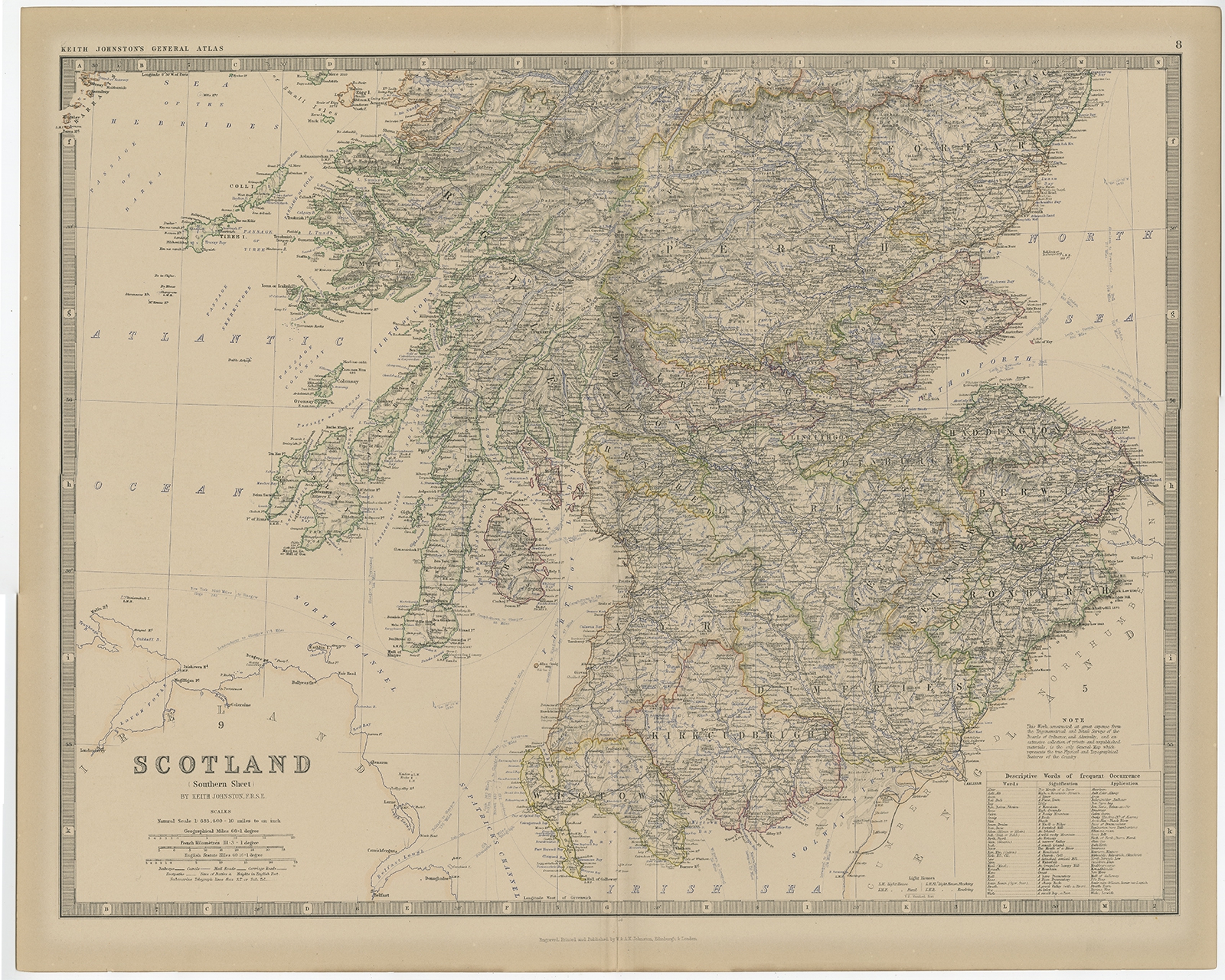 Antique Map of Southern Scotland by Johnston (1882) $ 154.68 Availability: in stock Condition : Good, general age-related toning. Please study image carefully. Date : 1882 Overall size : 61.4 x 49.5 cm. Image size : 57.3 x 44.3 cm. Description: Antique map titled 'Scotland'. Old map of Southern Scotland. This map originates from 'The Royal Atlas of Modern Geography, Exhibiting, in a Series of Entirely Original and Authentic Maps, the Present Condition of Geographical Discovery and Research in the Several Countries, Empires, and States of the World' by A.K. Johnston. Published by W. and A.K. Johnston, 1882. Artists and Engravers: Alexander Keith Johnston LLD (1804-1871) was a Scottish geographer. He was a pupil of the Edinburgh engraver and mapmaker, James Kirkwood. In 1826, he joined his brother William (who would become Sir William Johnston, Lord Provost of Edinburgh) in a printing and engraving business, forming the well-known cartographical firm of W. and A. K. Johnston. |