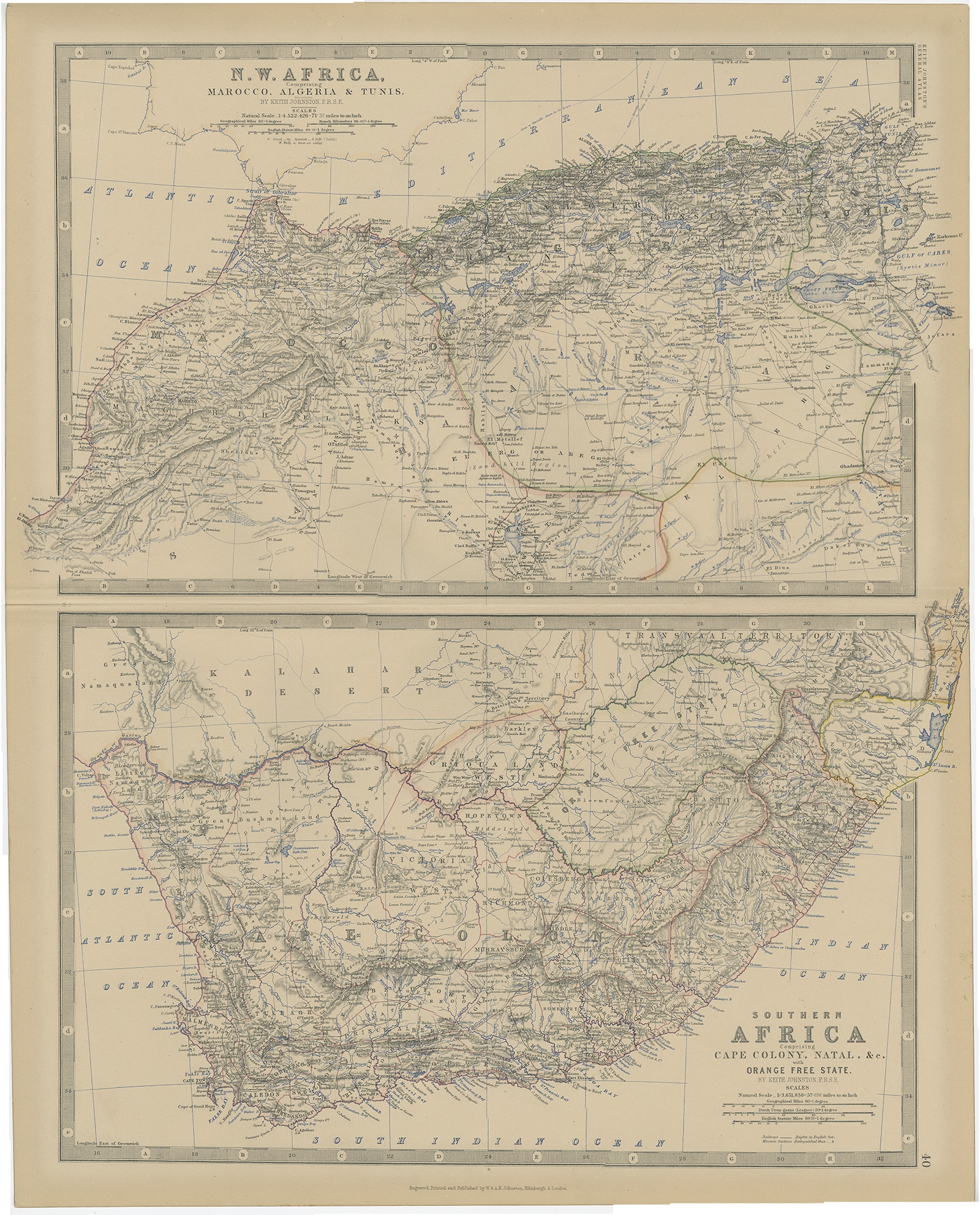 Antique Map of North and South Africa by Johnston (1882) $ 168.48 Availability: in stock Condition : Good, general age-related toning. Please study image carefully. Date : 1882 Overall size : 49.5 x 61.9 cm. Image size : 44.5 x 49 cm. Description: Two antique maps on one sheet titled 'N.W. Africa, Marocco, Algeria & Tunis' and 'Southern Africa, comprising Cape Colony, Natal & c'. This map originates from 'The Royal Atlas of Modern Geography, Exhibiting, in a Series of Entirely Original and Authentic Maps, the Present Condition of Geographical Discovery and Research in the Several Countries, Empires, and States of the World' by A.K. Johnston. Published by W. and A.K. Johnston, 1882. Artists and Engravers: Alexander Keith Johnston LLD (1804-1871) was a Scottish geographer. He was a pupil of the Edinburgh engraver and mapmaker, James Kirkwood. In 1826, he joined his brother William (who would become Sir William Johnston, Lord Provost of Edinburgh) in a printing and engraving business, forming the well-known cartographical firm of W. and A. K. Johnston. |