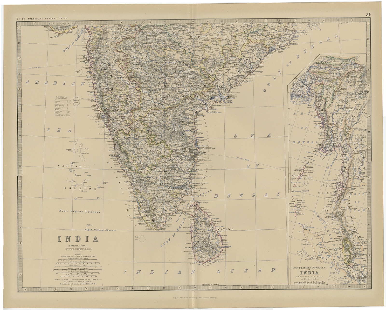 Antique Map of Southern India by Johnston (1882) $ 341.30 Availability: in stock Condition : Good, general age-related toning. Please study image carefully. Date : 1882 Overall size : 61.8 x 49.6 cm. Image size : 57.3 x 44.2 cm. Description: Antique map titled 'India (Southern Sheet)'. Old map of Southern India and Ceylon (Sri Lanka). With an inset map of the South-Eastern Provinces of India. This map originates from 'The Royal Atlas of Modern Geography, Exhibiting, in a Series of Entirely Original and Authentic Maps, the Present Condition of Geographical Discovery and Research in the Several Countries, Empires, and States of the World' by A.K. Johnston. Published by W. and A.K. Johnston, 1882. Artists and Engravers: Alexander Keith Johnston LLD (1804-1871) was a Scottish geographer. He was a pupil of the Edinburgh engraver and mapmaker, James Kirkwood. In 1826, he joined his brother William (who would become Sir William Johnston, Lord Provost of Edinburgh) in a printing and engraving business, forming the well-known cartographical firm of W. and A. K. Johnston. |