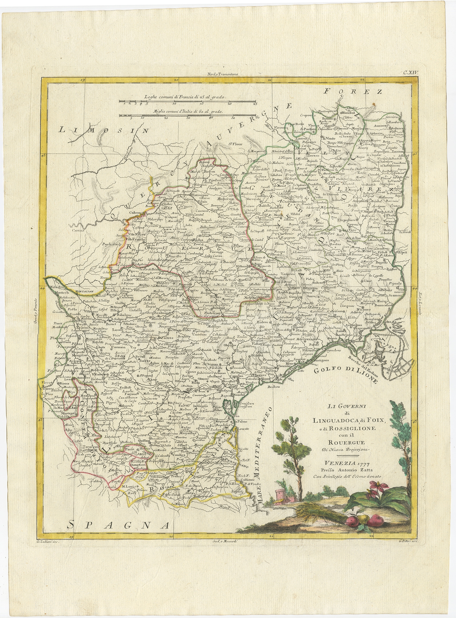 Antique Map of the Region of Languedoc, Foix, Roussillon and Rouergue by Zatta (1779) $ 199.53 Availability: in stock Condition : Very good, general age-related toning. Original/contemporary hand coloring. Please study image carefully. Date : 1779 Overall size : 38 x 52.5 cm. Image size : 32 x 40 cm. Description: Antique map titled 'Li Governi di Linguadoca, di Foix e di Rossiglione con il Rouergue'. Old map of France showing the regions of Languedoc, Foix, Roussillon and Rouergue. This map originates from 'Atlante Novissimo, illustrato ed accresciuto sulle osservazioni, e scoperte fatte dai piu' celebri e piu' recenti geografi' by A. Zatta. Artists and Engravers: Antonio Zatta (active 1757-1797) was the most prominent Italian map publisher of the late 18th and early 19th century. His firm, based in Venice, produced maps that mark an important transition from 18th to 19th century cartographic styles. |