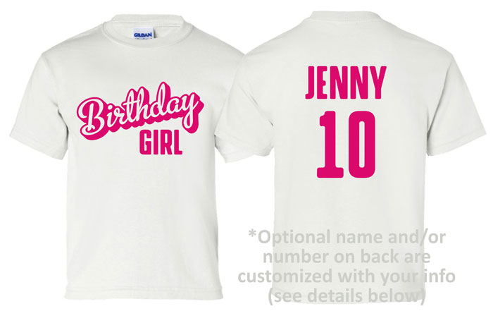 ![]() This listing is for a brand new "Birthday Girl" youth size t-shirt. This 100% cotton Gildan shirt is available in white, black, heather gray, jade (turquoise), light pink, and hot pink (heliconia). If you would like a different color shirt just let us know. This shirt features a one color design printed on front in your choice of 15 print colors (see options below.) You can also add a custom name and/or number on back! This listing is for youth sizes small through XL. This design can also be printed on toddler and adult size shirts. Please contact us if you have any questions. See below for dimension by size for this listing... Youth Small (6-8) Width: 17", Length: 22" Youth Medium (10-12) Width: 18", Length: 23.5" Youth Large (14-16) Width: 19", Length: 25" Youth XL (18-20) Width: 20", Length: 26.5" Please note: If you select the options to add a name and/or number to the back of your shirt please be sure to add a note in the "Message to Seller" section during checkout (or send us a message) with the details for your shirt. Please read instructions below before completing your purchase. Important! Please add a note during checkout with the following information: 1. If you would like a different shirt or print color than the options shown please add a note during checkout with the details for your shirt.