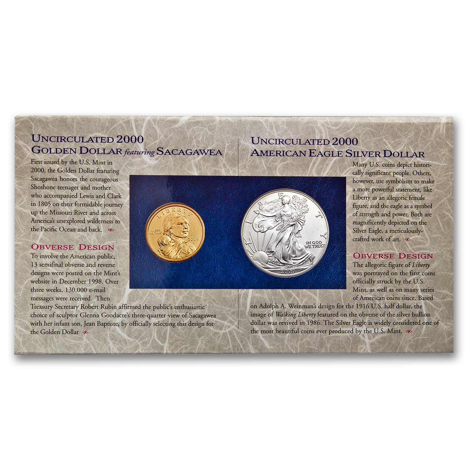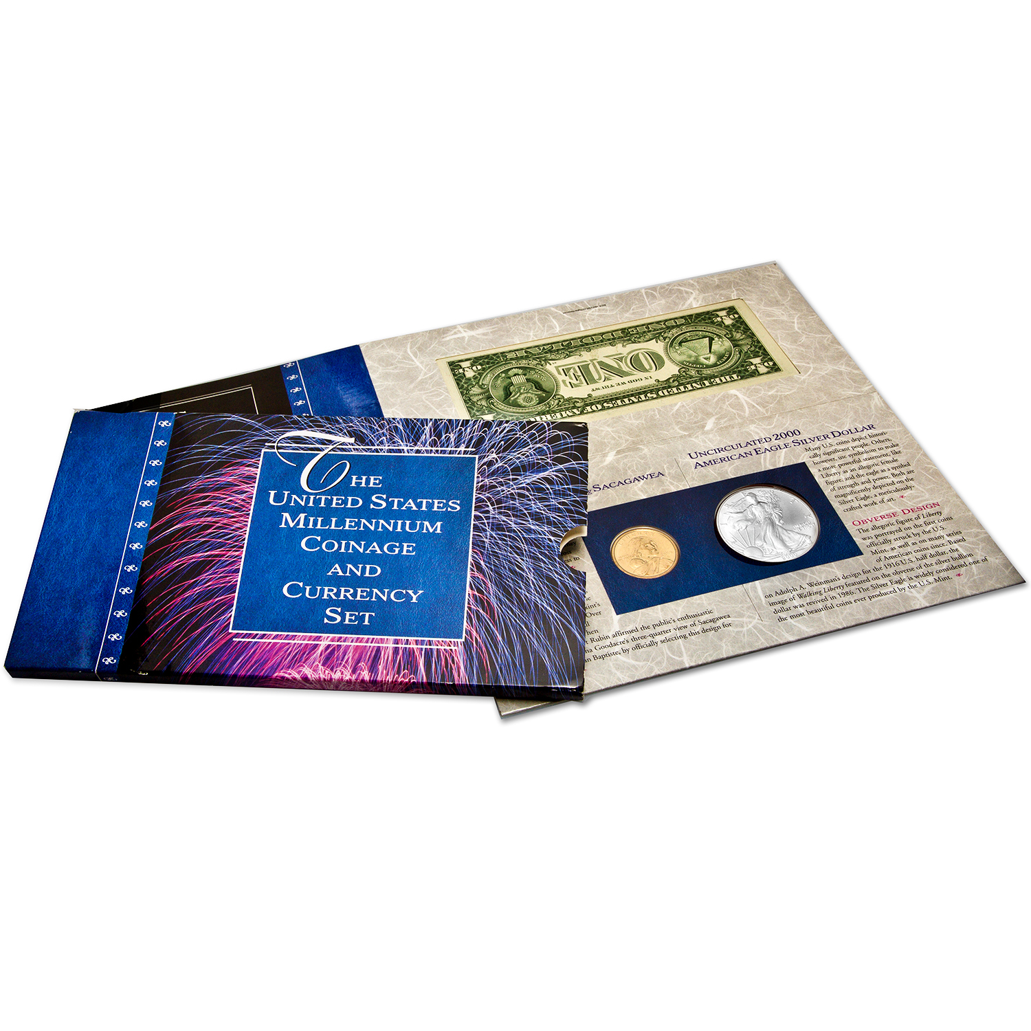 • 2000-dated Sacagawea dollar, released in a unique burnished finish for this set only.
