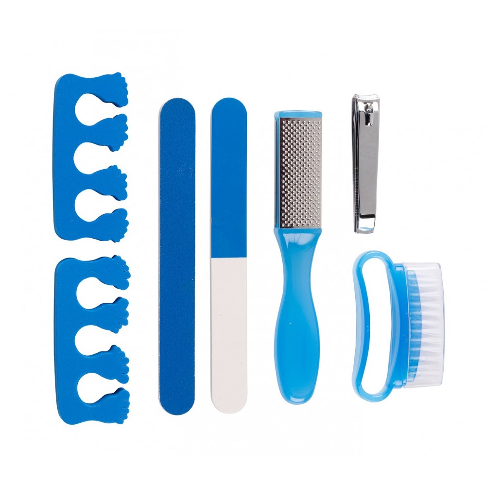 Pièces du set : 2 séparateurs de doigts en éponge, 2 limes, 1 coupe-ongles, 1 râpe à callosités, 1 brosse