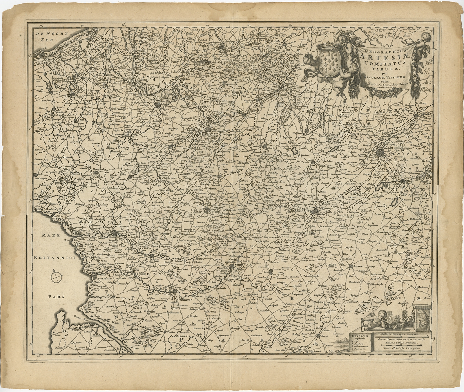 Antique Map of the Artois region by Visscher (c.1690) $ 383.53 Availability: in stock Condition : Fair, age-related toning and some staining (mainly in margins). Several larger creases and few other minor defects. Blank verso, please study image carefully. Date : c.1690 Overall size : 62 x 53.5 cm. Image size : 56.5 x 47 cm. Description: Antique map titled 'Geographica Artesiae Comitatus Tabula'. Large map of the Artois region, France. Also shows part of Flanders. Artists and Engravers: Nicolaes Visscher II (1649, Amsterdam – 1702, Amsterdam) was a Dutch engraver, cartographer and publisher. He was the son of Nicolaes Visscher I and the grandson of Claes Janszoon Visscher. After his death, his wife, Elisabeth, continued the family tradition of mapmaking and publishing. The works, engraved plates, were then sold to Peter Schenk, who also reprinted them. |