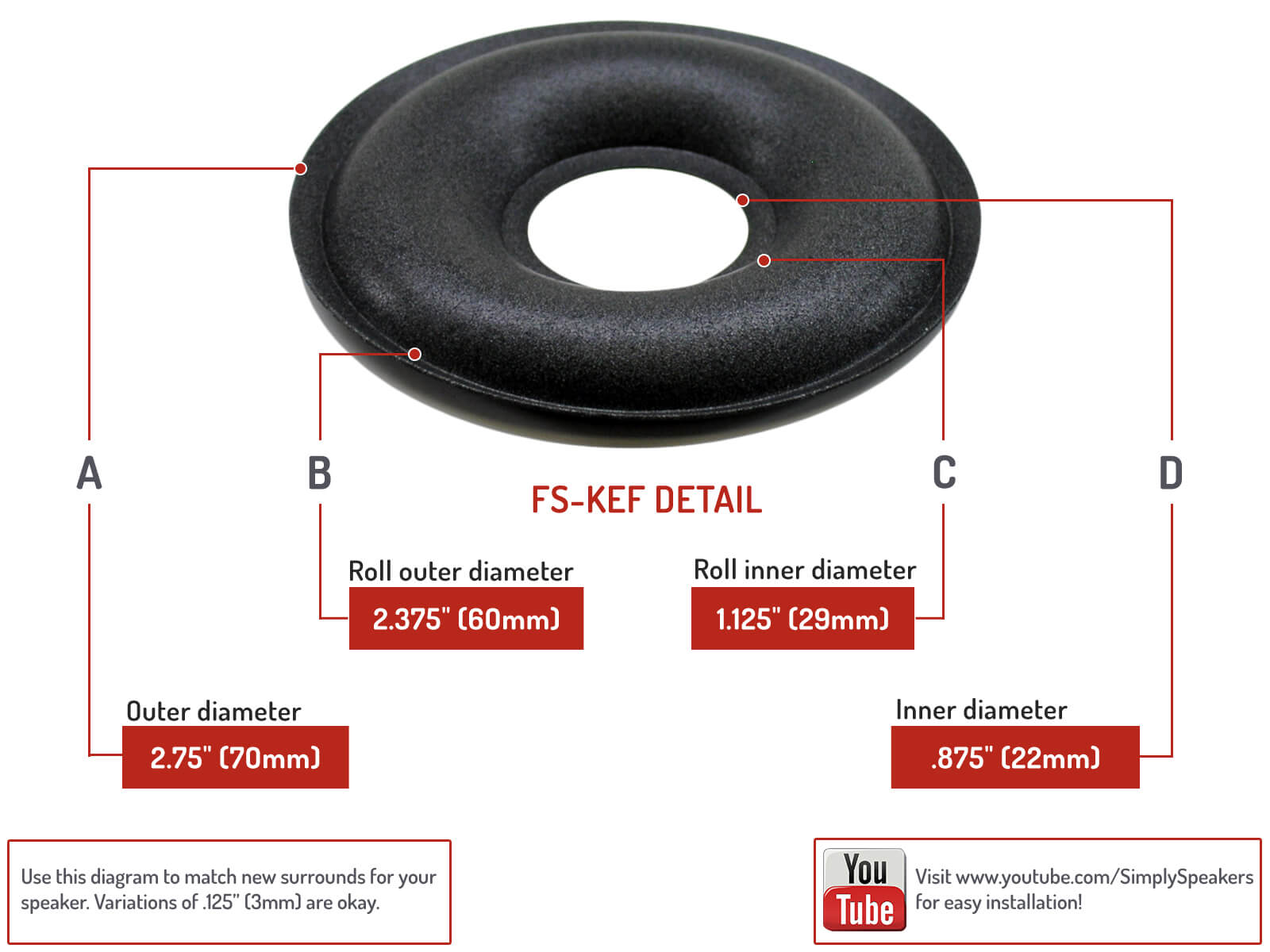 4 x brand new foam surrounds: Outer diameter: 2.75" (70mm), Roll outer diameter: 2.375" (60mm), Cone diameter: 1.125" (29mm), Inner diameter: .875" (22mm)