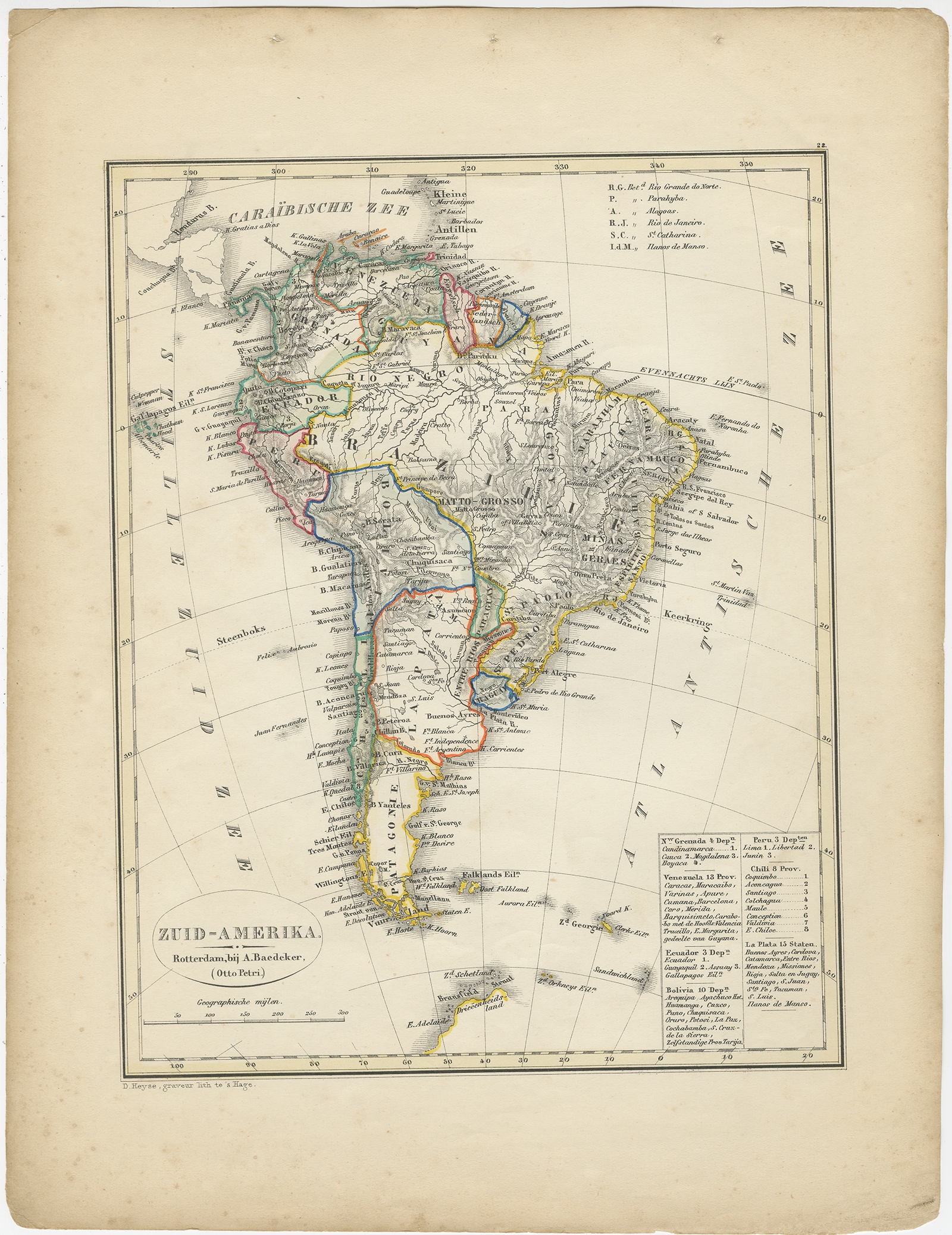 Antique Map of South America by Petri (1852) $ 152.38 Availability: in stock Condition : Good, general age-related toning. Minor wear, mainly in margins. Blank verso, please study image carefully. Date : 1852 Overall size : 27 x 34.5 cm. Image size : 20.5 x 26 cm. Description: Antique map titled 'Zuid-Amerika'. Map of South America. This map originates from 'School-Atlas van alle deelen der Aarde' by Otto Petri. Artists and Engravers: Published by A. Baedeker (Otto Petri). |