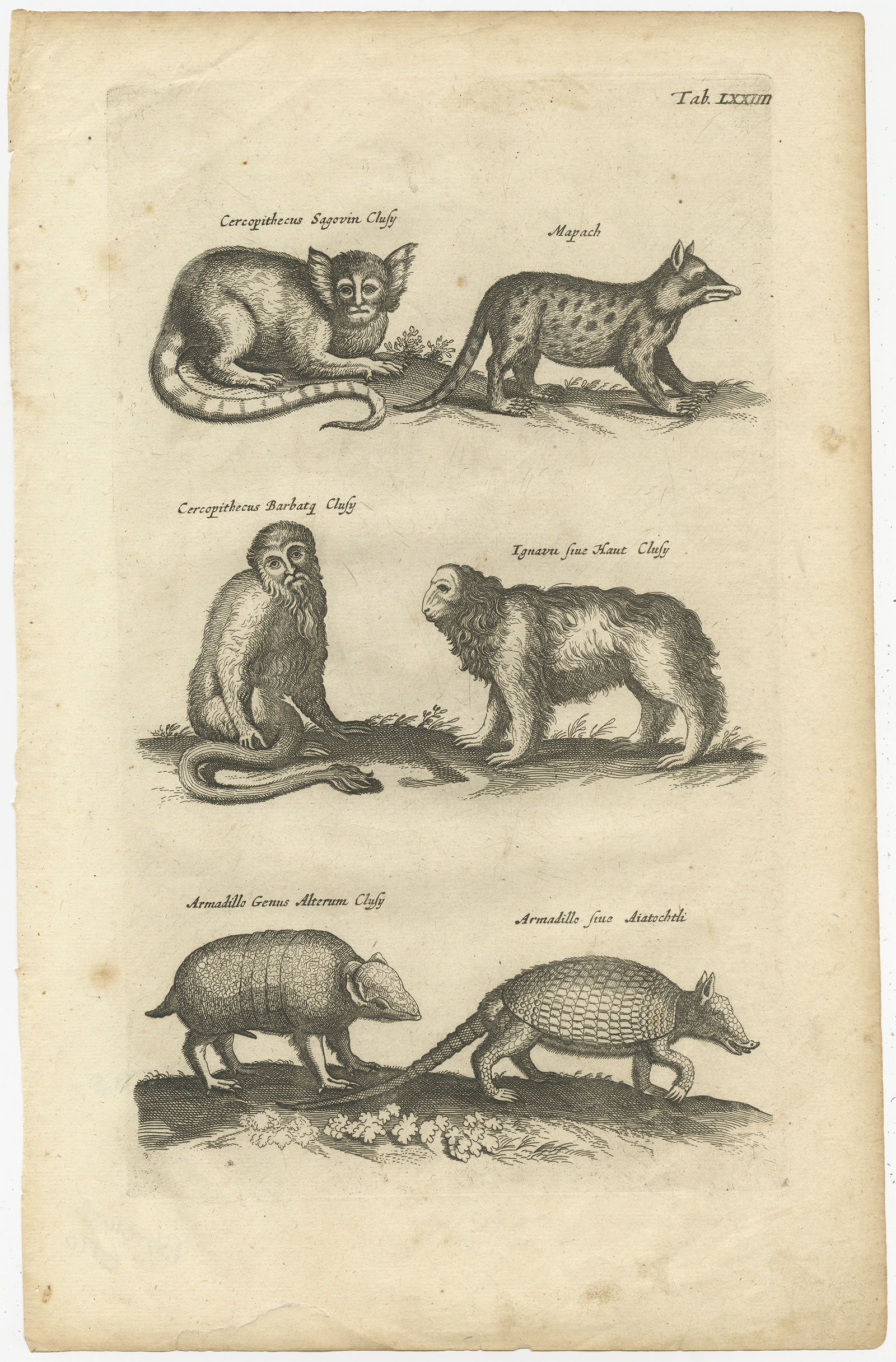Pl. 74 Antique Print of various Animals by Merian (1657) $ 113.28 Availability: in stock Condition : Fair/good, age-related toning. Repair on bottom margin. Minor wear and soiling, blank verso. Please study image carefully. Date : 1657 Overall size : 22.5 x 35.5 cm. Image size : 17 x 26 cm. Description: Antique print of various animals; Cercopithecus Sagovin Clusy (Guenon species) - Mapach (Racoon) - Cercopithecus Barbatus Clusy (Guenon species) - Iguavu sive Haut clusy - Armadillo Genus alterum Clusy - Armadillo sive Aiatochtli (Armadillo species). This print originates from 'Historiae Naturalis (..)' by John Johnston, published by Matthias Merian in 1657. Artists and Engravers: John Johnston (or Johnstone, 1603-1675) was a descendant of a Scottish family. Born in Sambter, Poland, he studied extensively at the famous universities of the day, including St. Andrews, Scotland, Cambridge & Leiden. After many years traveling in Europe, he settled in Silesia. Matthaus Merian was a leading German engraver of the day, from a prominent family of engravers and artists, and the father of Maria Merian. |