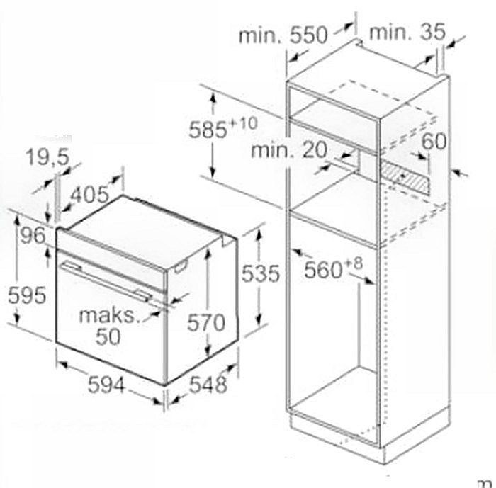 Hersteller: Siemens HB532 Energieeffizienzklasse: A - Skala von A(niedriger Verbrauch) bis G(hoher Verbrauch) Energieverbrauch bei konventioneller Beheizung (kWh) 0,97 Energieverbrauch bei Heißluft/Umluft (kWh) 0,81 Netto-Backraumvolumen (Liter) 71 Liter Größe - Groß 71L Geräuschemission in dB (A) re 1 pW50 Gerätemaße (HxBxT) (mm) 595 x 594 x 548 mm Nischenmaße (HxBxT) (mm) 560mm - 568mm x 585mm - 595mm x 550 mm Anschlußwert (W) 3600 Watt Gewicht mit Verpackung: 31,8 kg