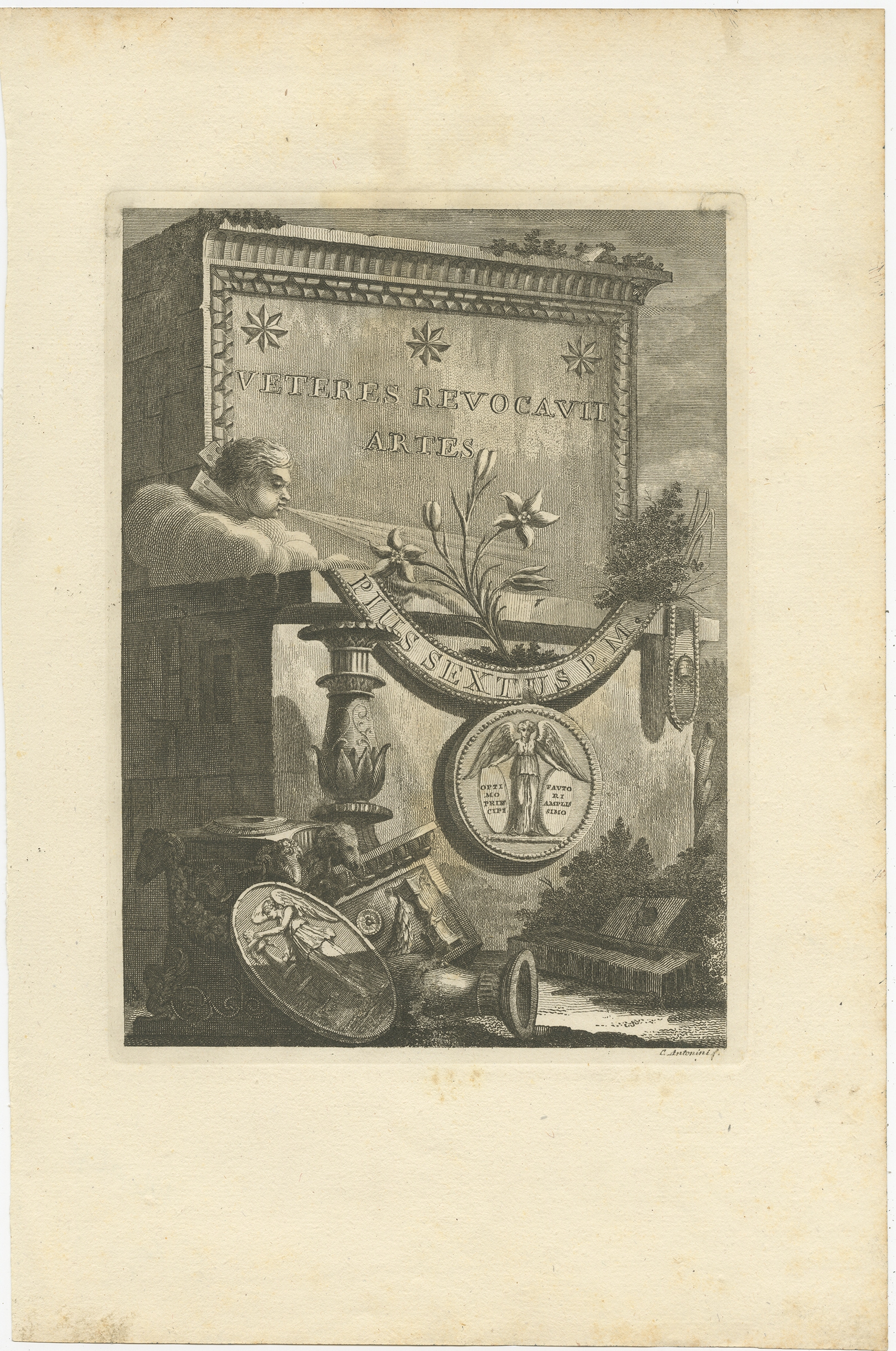 Antique Frontispiece of 'Manuale di varj ornamenti (..)' by Antonini (1781) $ 104.16 Availability: in stock Condition : Good, general age-related toning. Minor wear and soiling, blank verso. Please study image carefully. Date : 1781 Overall size : 23 x 34.5 cm. Image size : 15.5 x 21.5 cm. Description: Antique frontispiece of volume 3 of 'Manuale di varj ornamenti tratti dalle fabbriche, e frammenti antichi' by Carlo Antonini. This work contains a series of ancient chandeliers. Artists and Engravers: Carlo Antonini was a draughtsman, engraver and architect. He worked in Rome and Modena. |