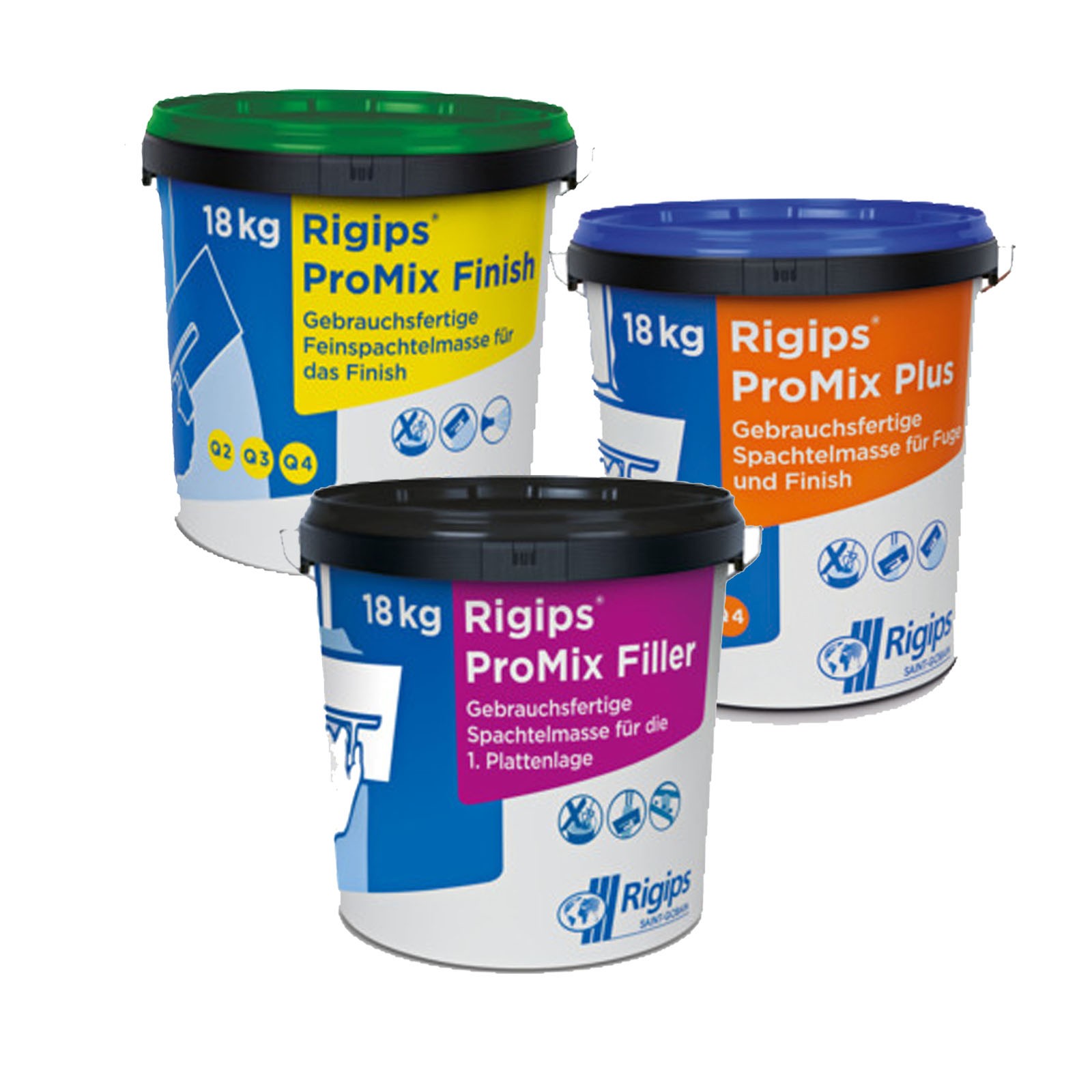 Der ProMix Plus von Rigips ist eine gebrauchsfertige Spachtelmasse für das Füllen von Fugen von Rigips-Gipsplatten in Verbindung mit dem Rigips Papierbewehrungsstreifen und für das Fugen- und Oberflächenfinish auf Gipskartonoberflächen, Beton, rauen Putzflächen und anderen Untergründen.