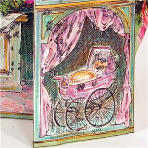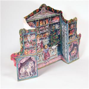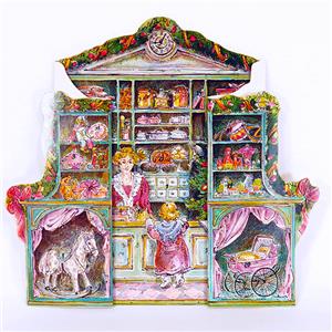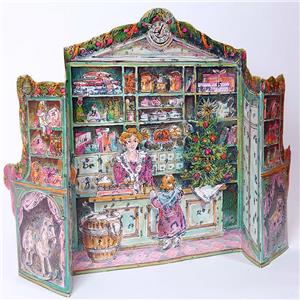 New Old Store Stock. Vintage 1980s beautiful 5-Panel Stand up Victorian Store traditional Advent Calendar. Made in West Germany by Korsch Verlag #14454. Calendar has 24 windows that include Christmas pictures when opened. This Calendar is in exceptional condition. The colors are vibrant with rose, green, gold and silver glitter.