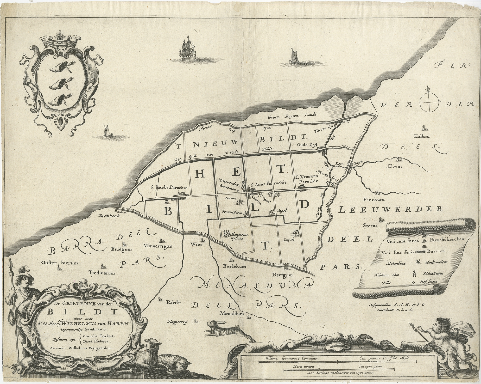 Antique Map of the Bildt region by Schotanus (1664) $ 128.87 Availability: in stock Condition : Fair, general age-related toning. Repairs on folding line and tears, also affecting image. Minor wear, blank verso. Please study image carefully. Date : 1664 Overall size : 36.5 x 29.5 cm. Image size : 36.5 x 28 cm. Description: Antique map titled 'De Grietenije van der Bildt (..)' Map of the Grietenij of Het Bildt, Friesland, The Netherlands. Multiple cartouches, key and coat of arms. Originates from "Beschrijvinge ende nieuwe caerten van de Heerlyckheydt van Frieslandt (…).", by Schotanus a Sterringa, first published in 1664. |