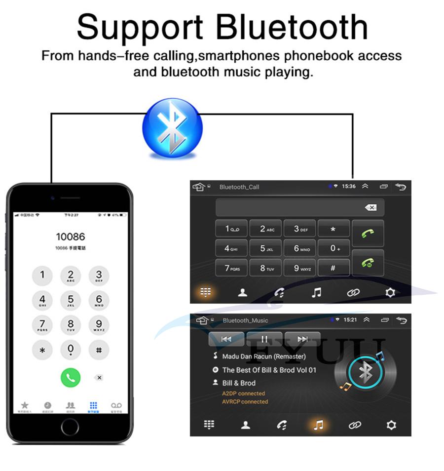 Bluetooth | - Hands Free: Yes - A2DP (Bluetooth Stereo Music): Yes, can play stereo music through Bluetooth - Bluetooth Music Control: Yes, play/pause/previous/next - PB-Download: Yes, can download phonebook from mobile to this unit - PB-Search: Yes, can use the first letter to search contact member in PB-Listings - Calling Records: Yes, Dialed Call, Received Call, Missed Call - Setup: Auto Answer, Auto connect, Device name - Built-in Microphone: Yes, on the front panel - External Microphone Jack:Yes on the RCA cable |