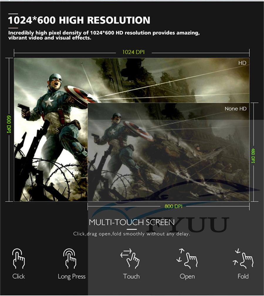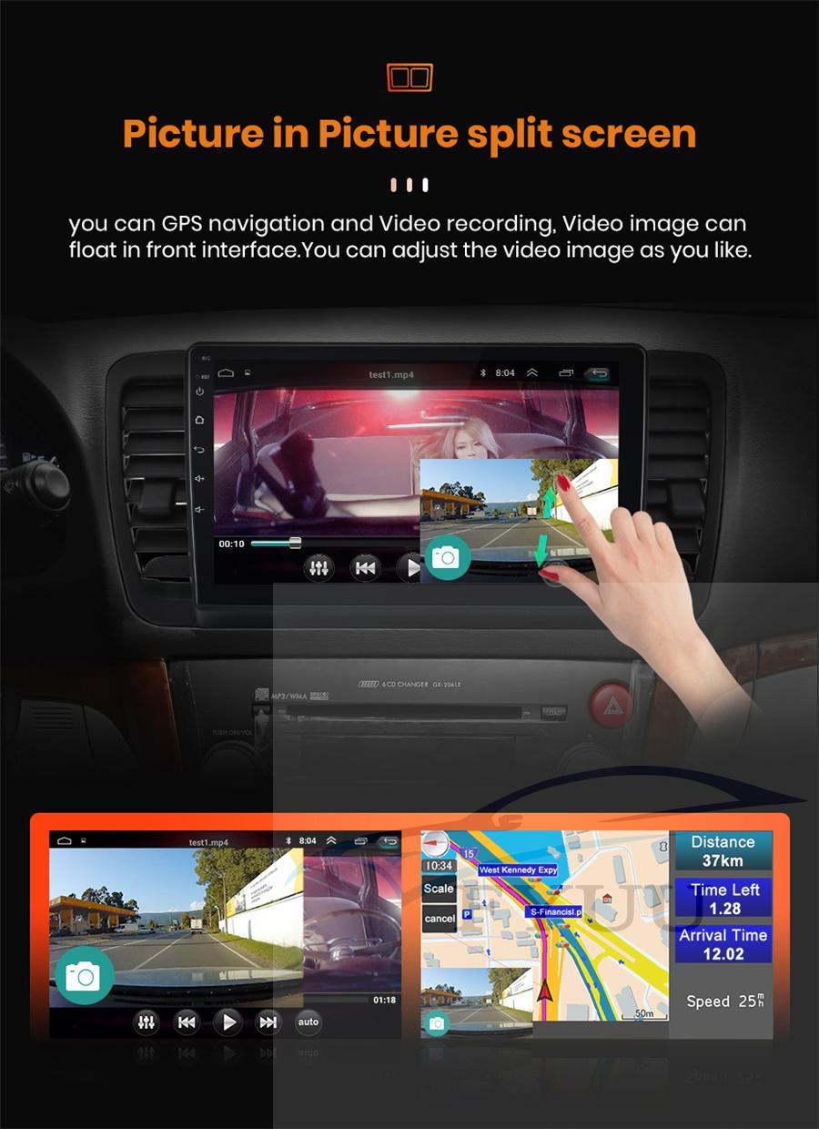 Display | - Touch Screen: Yes - Resolution: 1024*600 - Capacitive or Resistance Screen: Capacitive - Built-in Clock and Calendar: Yes, show real time and can use network-provided time - Main Menu Status Bar display: Can be changed to Music/Radio/BT-Stereo Player and Clock/Date/Week - Change Apps-Icon Position: Yes - Picture in picture split screen:Support |