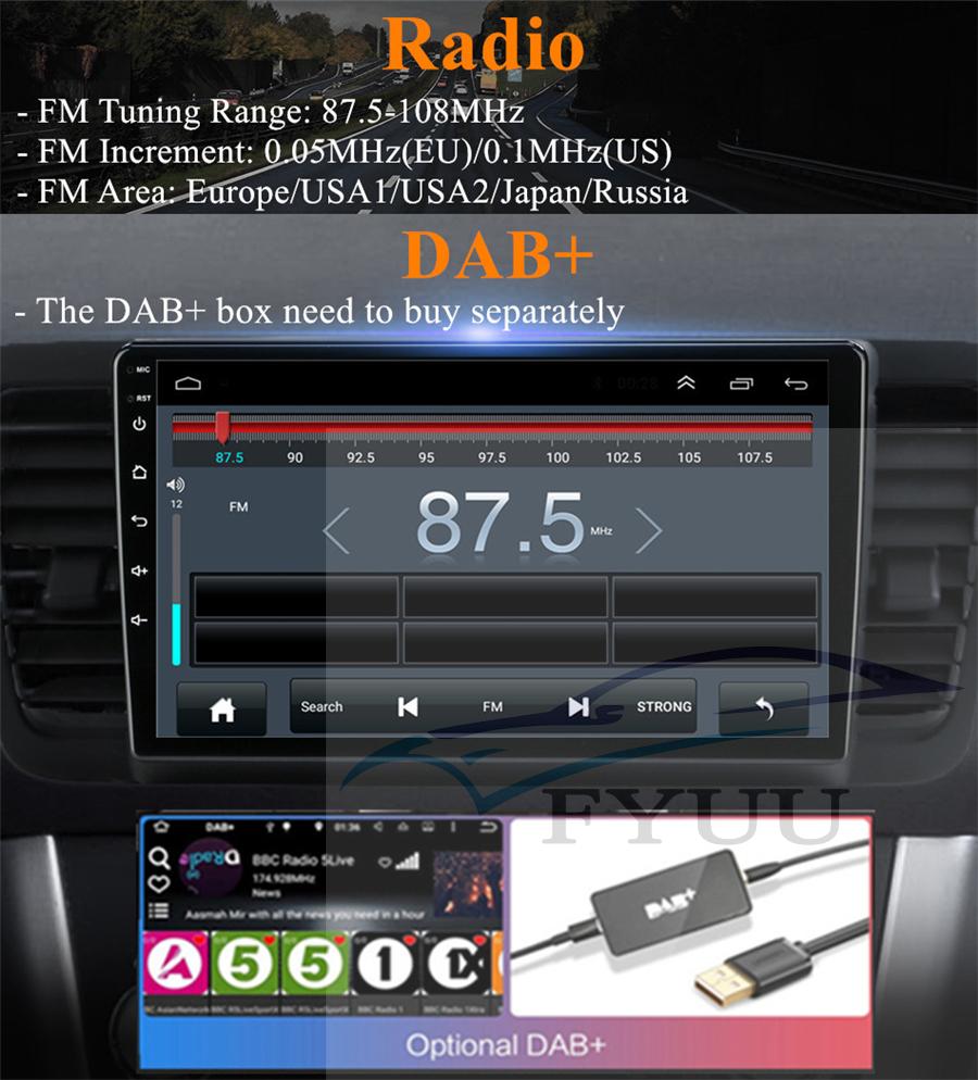 Radio | - FM Tuning Range: 87.5-108MHz - FM Increment: 0.05MHz(EU)/0.1MHz(US) - FM Area: Europe/USA1/USA2/Japan/Russia |