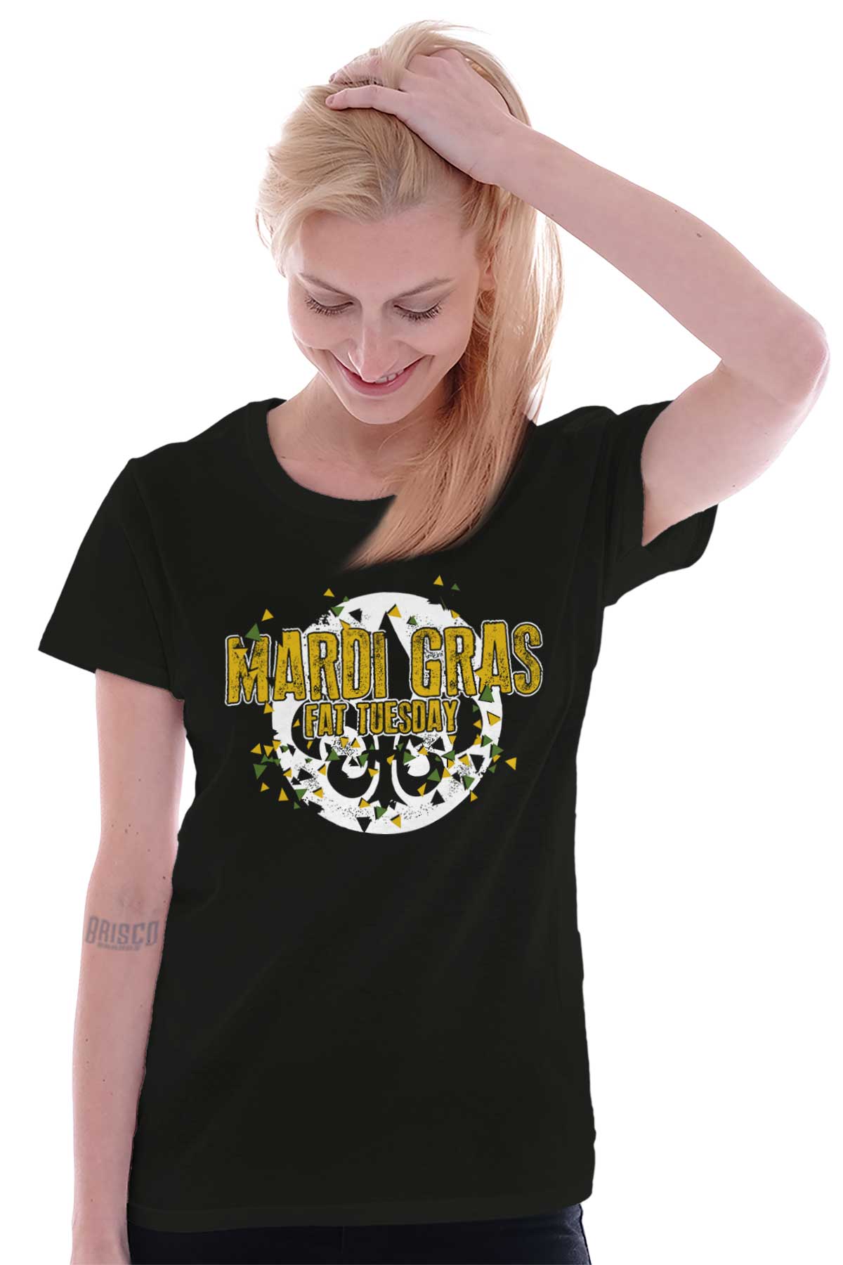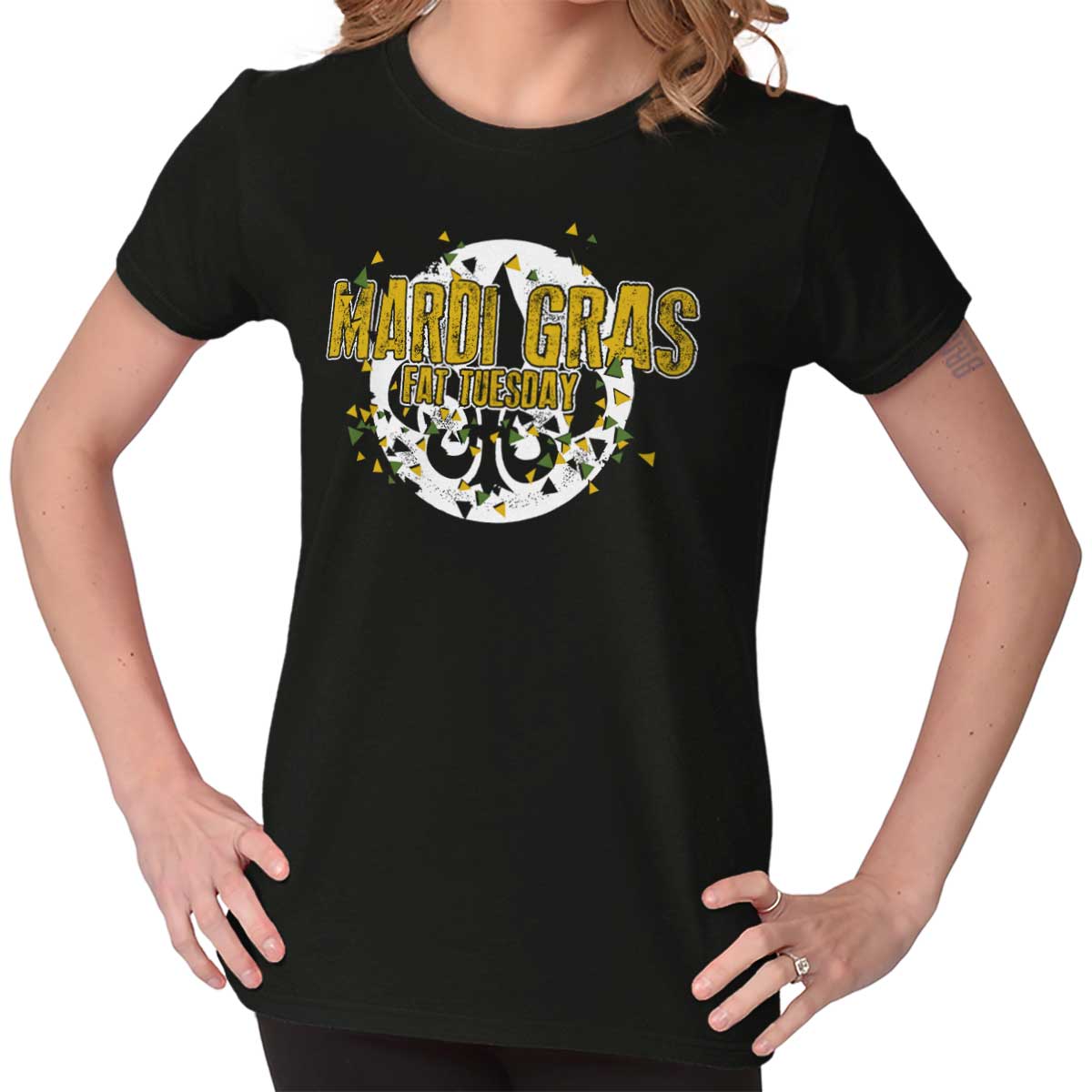 Mardi Gras: the French term translates to Fat Tuesday. Quite an apropos name for the day before Lent; forty days of fasting before the Easter celebrations begin. Celebrate this one last big hurrah in style with this Ladies T-Shirt . You will feel like you are part of parade down Bourbon Street, no mask required. Complete with the traditional New Orleans symbol of the fleur de lis, this Ladies T-Shirt pays tribute to the spirit of the Carnival with the customary purple, green, and gold. No beads included. We’ll let you get them yourself. Let the good times roll!