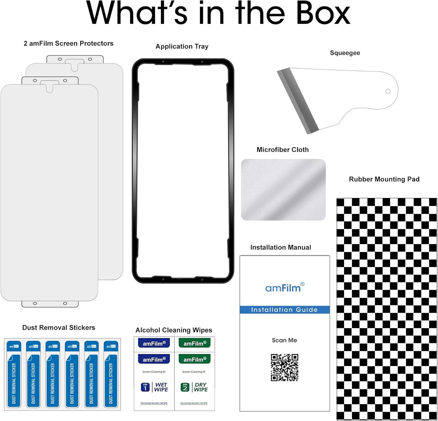 Includes: (2) Hybrid Screen Protectors, (1) Application Tray, (1) Rubber Mounting Pad, (1) Micro-Fiber Cleaning Cloth, (1) Squeegee, (2) Wet/Dry Wipes, (6) Dust Removal Stickers, (1) Installation/User Guide