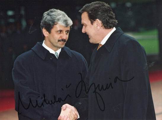Signed colour German press photograph, 9,5 x 7 inch, shows Prime Minister Mikulas Dzurinda in Bonn 1999 with German chancellor Gerhard Schroeder, signed by Mikulas Dzurinda in black sharpie, in very fine condition.