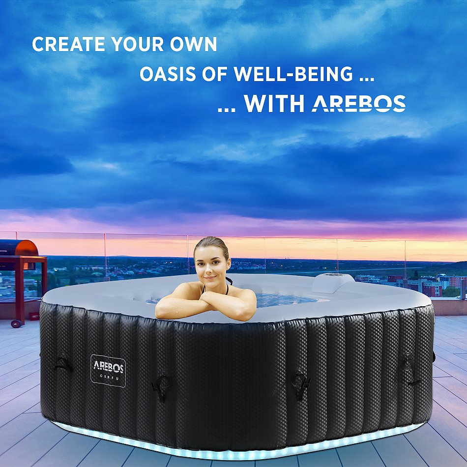 Experimente una relajación de lujo con la piscina de hidromasaje AREBOS Spa Pool. Este elegante hidromasaje es ideal para interiores y exteriores y ofrece espacio para hasta 4 personas. Disfrute de la iluminación LED ambiental, que puede ajustarse en diferentes colores y modos mediante un mando a distancia para crear el ambiente perfecto.