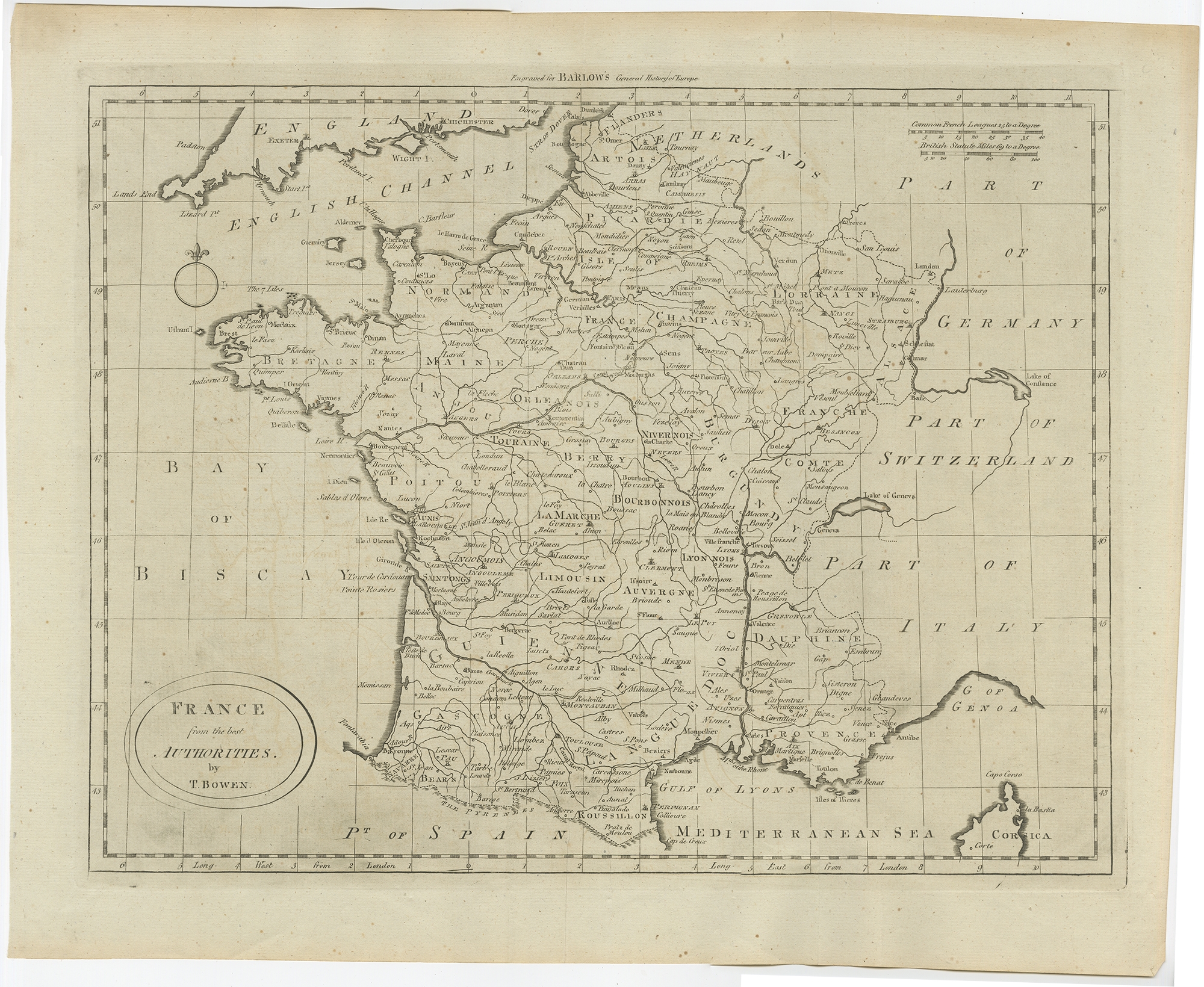 Antique Map of France by Bowen (c.1790) $ 399.56 Availability: in stock Condition : Good, gneral age-related toning. Original foldig lines. Few tiny defects in image. Blank verso. Please study image carefully. Date : c.1790 Overall size : 49 x 39 cm. Image size : 42 x 32.5 cm. Description: Antique map titled 'France from the best Authorities'. Original antique map of France. Engraved for Barlow's General history of Europe. Published circa 1790. Artists and Engravers: Cartographer: Thomas Bowen. |