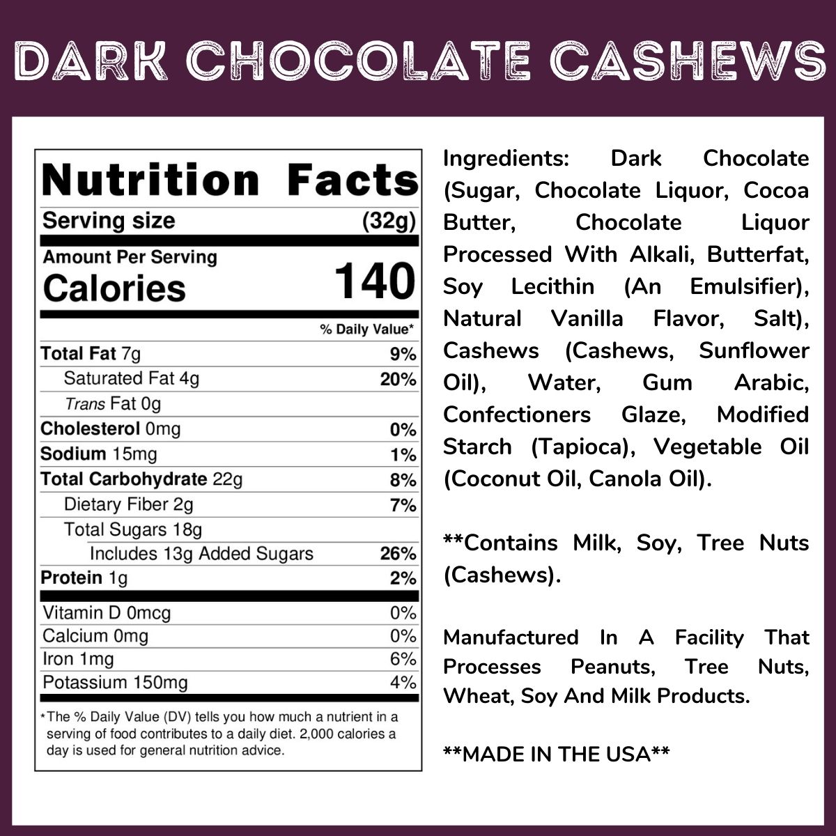 Dark Chocolate (Sugar, Chocolate Liquor, Cocoa Butter, Chocolate Liquor Processed With Alkali, Butterfat, Soy Lecithin (An Emulsifier), Natural Vanilla Flavor, Salt), Cashews (Cashews, Sunflower Oil), Water, Gum Arabic, Confectioners Glaze, Modified Starch (Tapioca), Vegetable Oil (Coconut Oil, Canola Oil).
