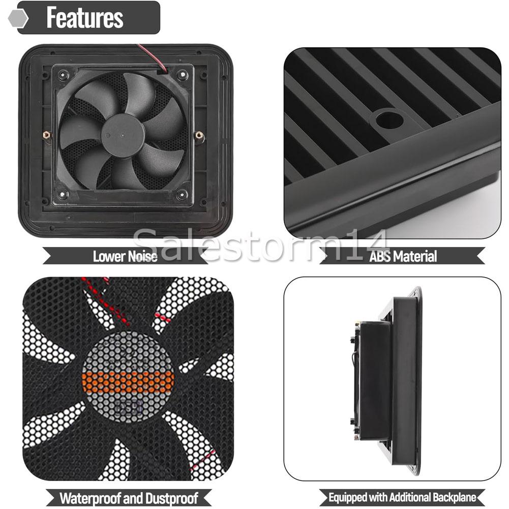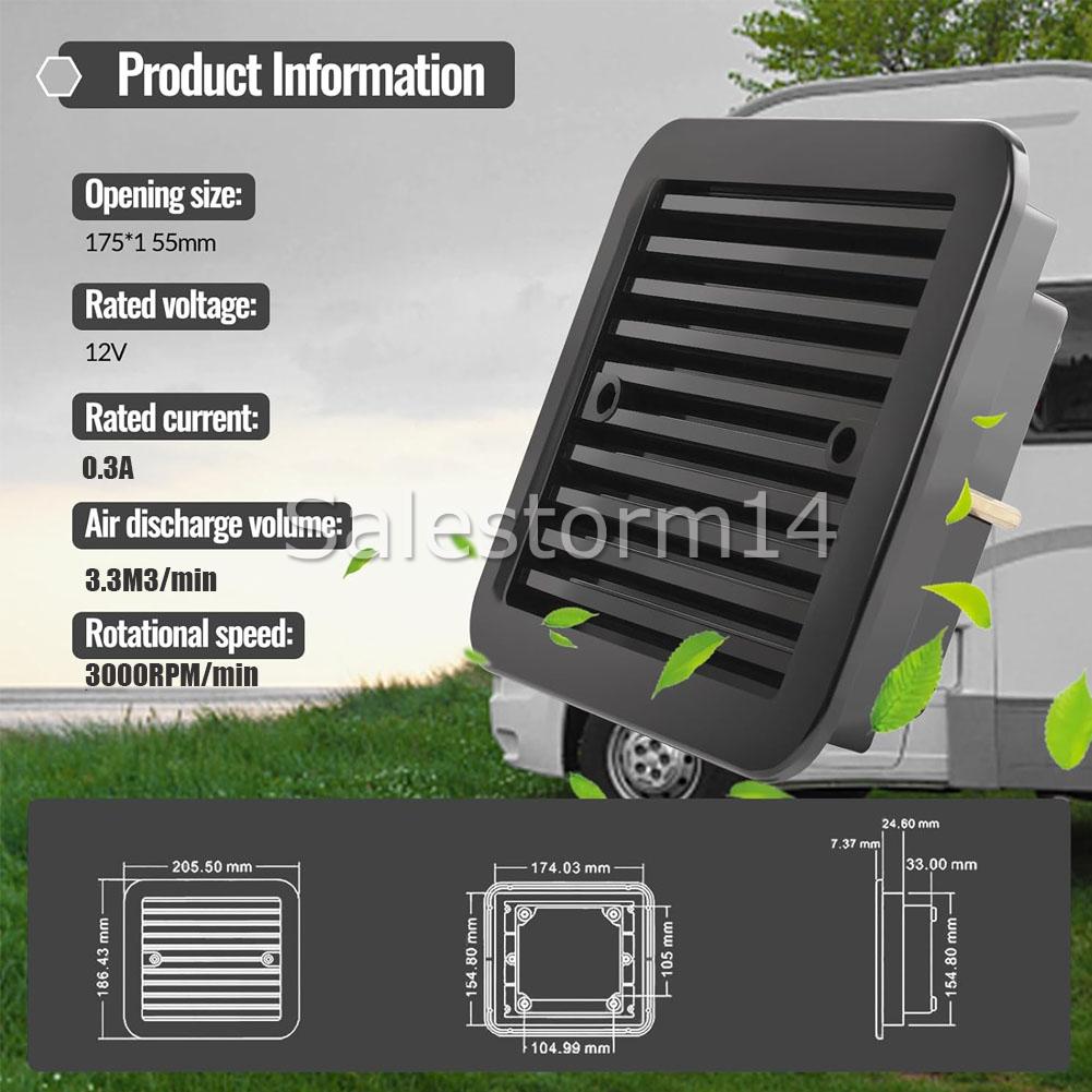 Fits for RV, camper, motorhome, trailer, boat, yacht etc. Adopts high quality material, durable to use Easy to install Color: Black (As Pictures Show) Rated Voltage: 12V Rated Current: 0.3A Exhaust volume: 3.3M3/min Speed: 3000RPM/min Opening Hole Dimension: 175*155mm (Approx.) Dimension: 205*185*70mm (Approx.) Package includes: 1 x Exhaust Fan and screws