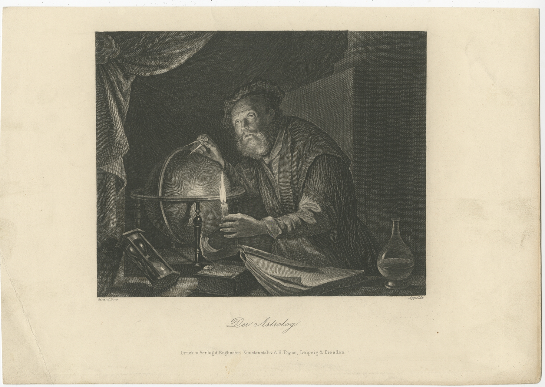 Antique Print of an Astrologer by Payne (c.1850) $ 164.18 Availability: in stock Condition : Fair/good, general age-related toning. Crease in left margin. Minor wear and soiling. Blank verso, please study image carefully. Date : c.1850 Overall size : 28 x 19.5 cm. Image size : 17 x 14 cm. Description: Antique print titled 'Der Astrolog'. Original antique print of an astrolog, also features a globe and hourglass. Published circa 1850. Artists and Engravers: Published by A.H. Payne. |