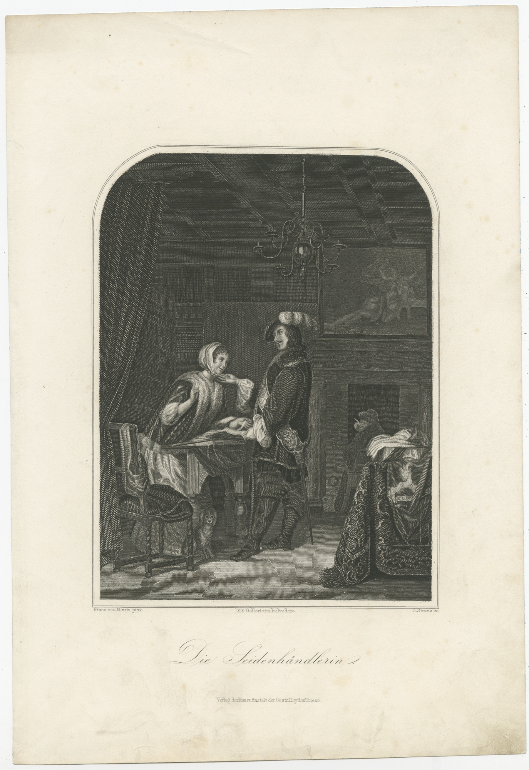 Antique Print of a Silk Merchant by Strunz (c.1850) $ 92.39 Availability: in stock Condition : Fair/good, general age-related toning. Shows some wear and soiling. Blank verso. Please study image carefully. Date : c.1850 Overall size : 20 x 29 cm. Image size : 13 x 18 cm. Description: Antique print titled 'Die Seidenhändlerin'. Original antique print of a silk merchant. Source unknown, to be determined. Published circa 1850. Artists and Engravers: Engraved by C. Strunz after a painting by F. van Mieris. |