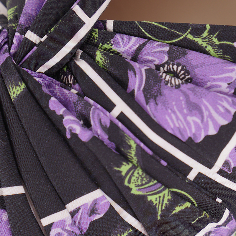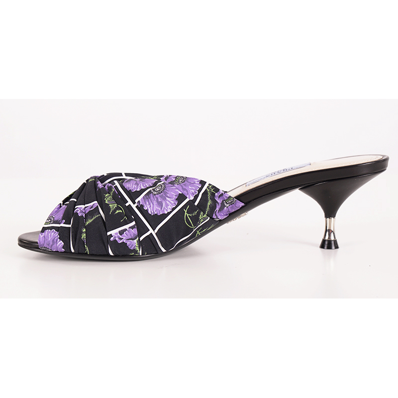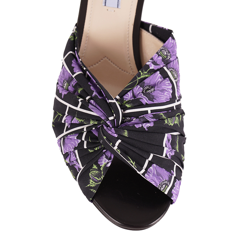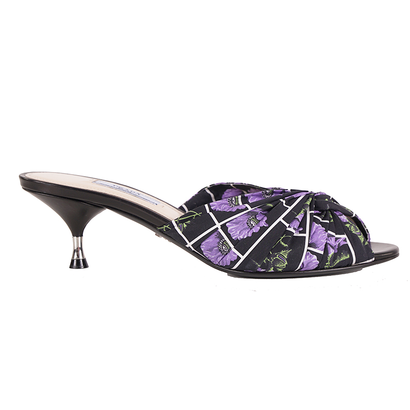 Authentic Prada sandals in a fresh floral print. Black with white mod grid has purple poppies floral print. Upper is a cotton with a gathered effect. Insole and soles are leather. Small kitten heel with silver metal accent. Style 1XX442. Made in Italy. So girly and fun, pair with a simple black dress to add some color or just skinny jeans and a tank.