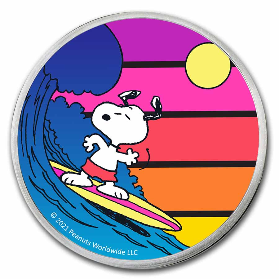 Whether you are a collector, gift-giver or a Snoopy fan, these rounds make a great gift to celebrate the summertime. Add this Peanuts® Sunset Surfing Snoopy 1 oz Silver Colorized round to your cart today!