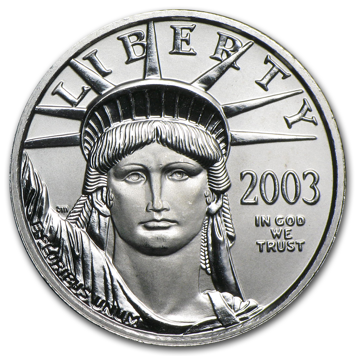 - Obverse: The strong face of the statue below the word Liberty, with the year and In God We Trust to the side. E Pluribus Unum is engraved along Liberty's raised arm.