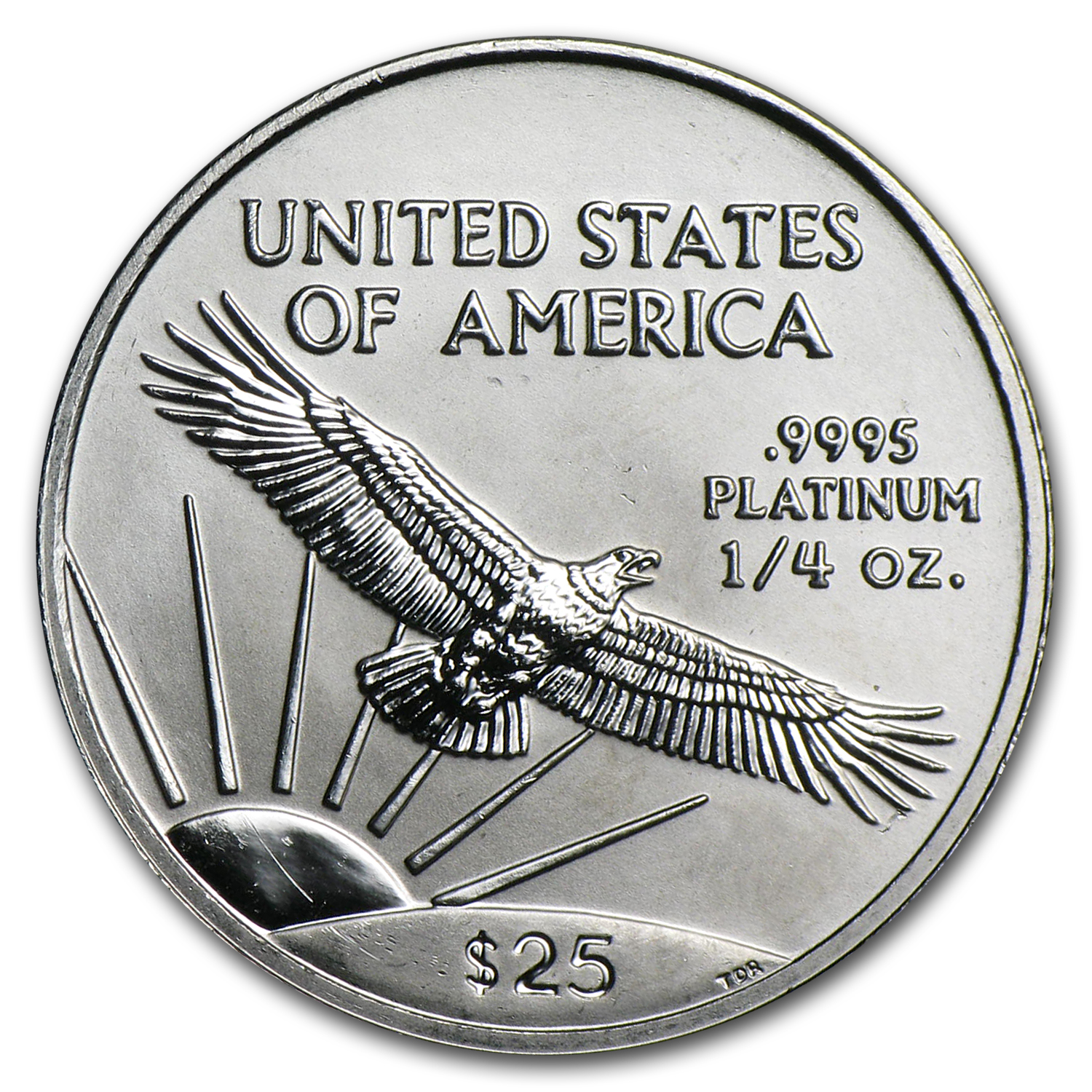 - Reverse: An American eagle with outstretched wings soaring in front of a sunrise with United States of America above. The weight, purity and $25 face value are also shown.