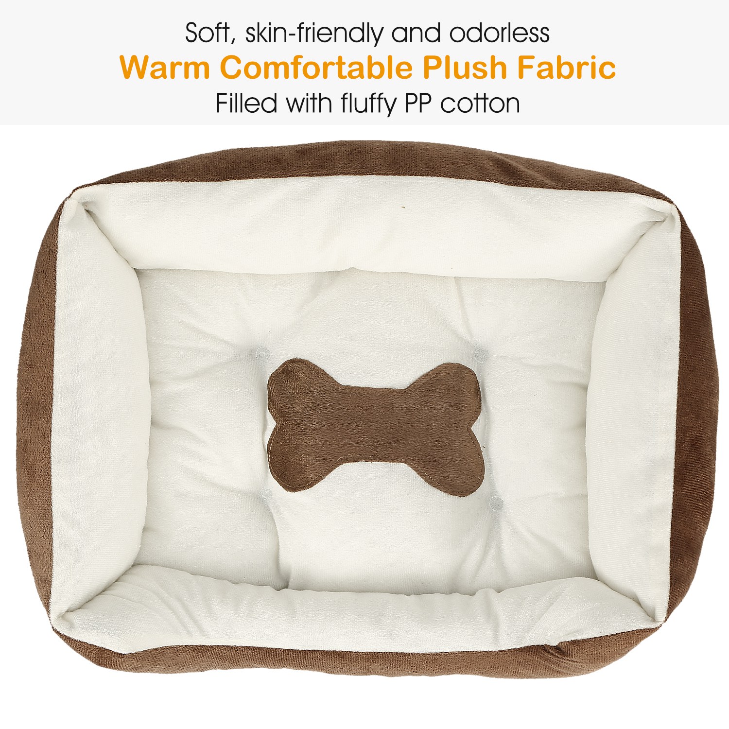Our dog bed is made from high-grade plush materials with fluffy PP cotton filling, soft, odorless and no static to keep your pet warm and comfortable. Its bottom mat adopts premium non-slip oxford fabric materials to directly isolate the moisture and effectively protect the dog from skin diseases. Five sizes are available for your different pets. Additionally, it is machine washable for easy cleaning and comes with a bonus wear-resistant and bite-resistant plush bone toy to play with your pet.