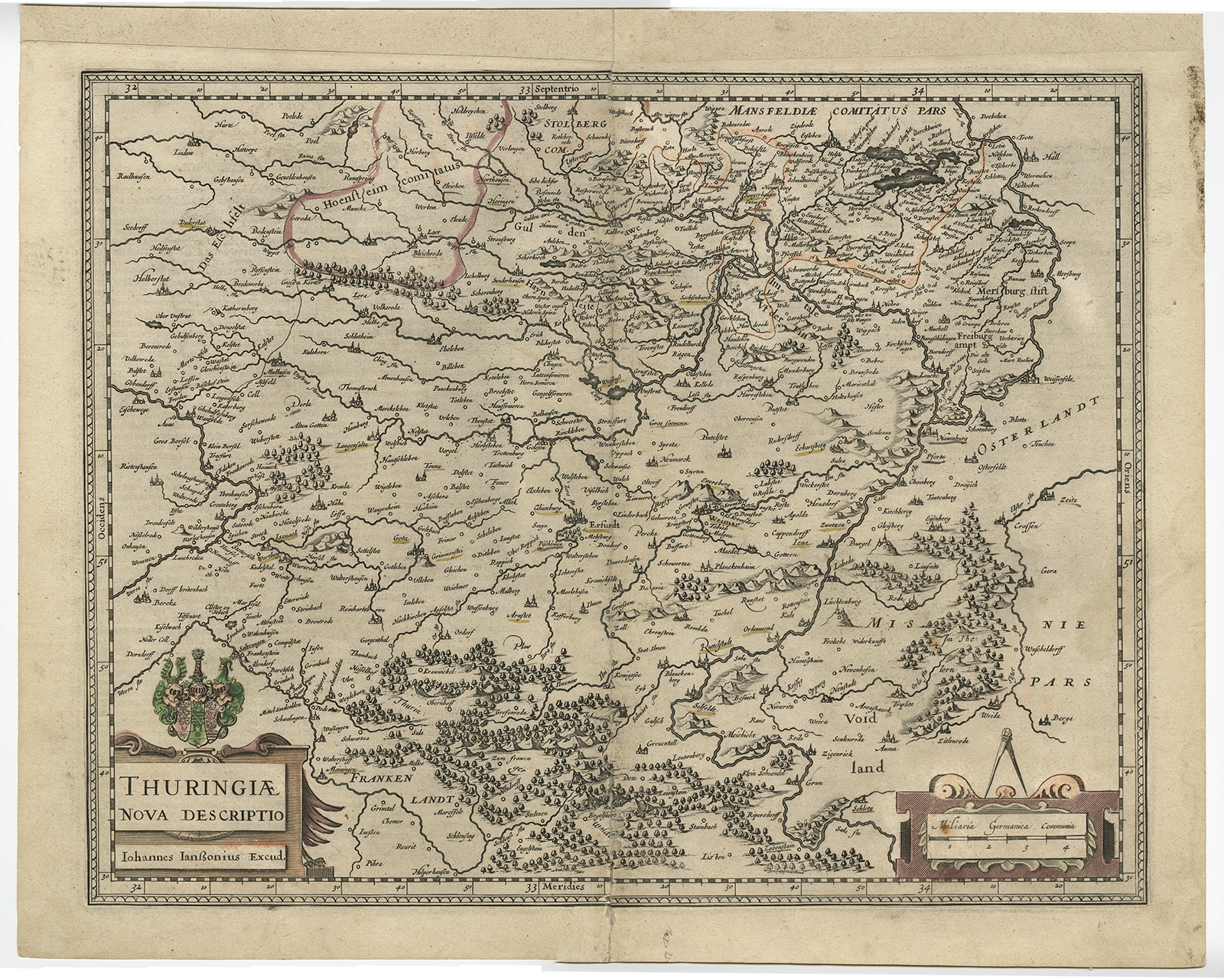 Antique Map of Thuringia by Janssonius (c.1650) $ 776.75 Availability: in stock Condition : Fair, given age. Paper separation upper and lower middle fold; repaired. A few spots. Top edge remargined (for framing). Original middle fold as issued. General age-related toning and/or occasional minor defects from handling. German text on verso. Please study image carefully. Date : c.1650 Overall size : 54 x 43.2 cm. Image size : 48.2 x 37.5 cm. Description: Antique map titled 'Thuringiae Nova Descriptio.' Detailed map of Thuringia, Germany by J. Janssonius. With one cartouche, coat-of-arms and a mileage scale. With Erfurt in the centre. German text on verso. Source unknown, to be determined. |
