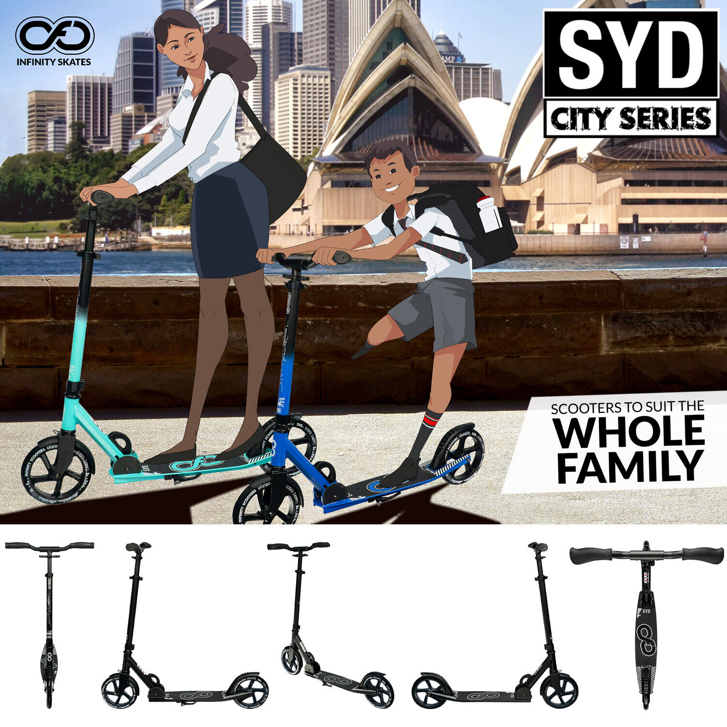 Sydney City Scooter by Infinity Scooters is the ultimate companion for urban commuting. (SYD) combines sleek style with unmatched functionality, effortlessly conquering any city ride or commute with its lightweight and compact design.