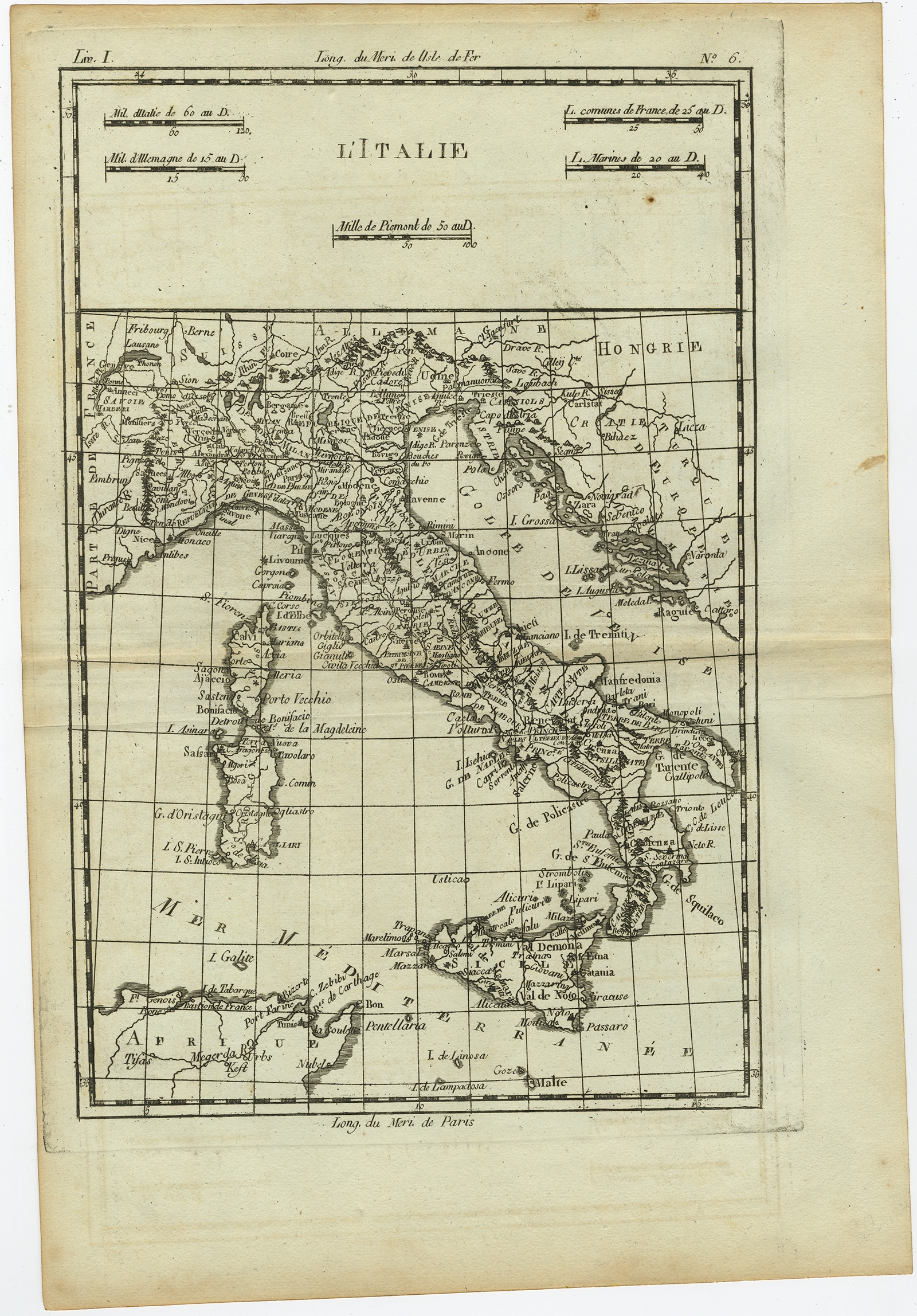 Antique Map of Italy by Bonne (c.1780) $ 376.61 Availability: in stock Condition : Good, given age. Slight discolouriation near middle fold. Paper slightly browned at places. Original middle fold as issued. General age-related toning and/or occasional minor defects from handling. Please study image carefully. Date : c.1780 Overall size : 26 x 38.5 cm. Image size : 20.5 x 32.3 cm. Description: Antique map titled 'L'Italie.' Map of Italy, Corsica, Sardinia and Sicily. Highly detailed, showing towns, rivers, some topographical features and political boundaries. Source unknown, to be determined. Artists and Engravers: Made by 'Rigobert Bonne' after an anonymous artist. Rigobert Bonne (1727-1795 ) was one of the most important cartographers of the late 18th century. In 1773 he succeeded Jacques Bellin as Royal Cartographer to France in the office of the Hydrographer at the Depôt de la Marine. Working in his official capacity Bonne compiled some of the most detailed and accurate maps of the period. Bonne's work represents an important step in the evolution of the cartographic ideology away from the decorative work of the 17th and early 18th century towards a more detail oriented and practical aesthetic. With regard to the rendering of terrain Bonne maps bear many stylistic similarities to those of his predecessor, Bellin. However, Bonne maps generally abandon such common 18th century decorative features such as hand coloring, elaborate decorative cartouches, and compass roses. While mostly focusing on coastal regions, the work of Bonne is highly regarded for its detail, historical importance, and overall aesthetic appeal. |