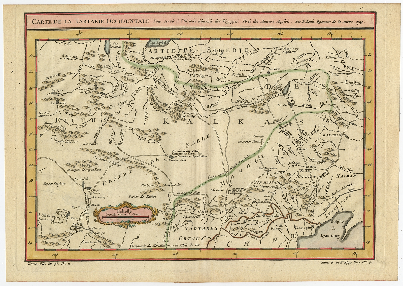Antique Map of Western Tartary by Bellin (1749) $ 517.83 instead of Availability: in stock Condition : Good, given age. Original middle fold as issued. General age-related toning and/or occasional minor defects from handling. Please study image carefully. Date : 1749 Overall size : 34.6 x 24.5 cm. Image size : 30.8 x 22 cm. Description: Antique map titled 'Carte de la Tartarie Occidentale pour Servir a l'Histoire Générale des Voyages. Tirée des Auteurs Anglois.' This map covers western Tartary and focuses on the region of present-day Mongolia. This map reflects information from Kyrkov's important surveys of this remote region in addition to Jesuit and English sources. It includes detail of the roads and shows sections of the Great Wall. Source unknown, to be determined. Artists and Engravers: Jacques-Nicolas Bellin (1703-1772) was a French hydrographer, geographer and member of The Philosophes. His career, spanning over 50 years, caused an enormous outpt in maps, particular of maritime interest. |