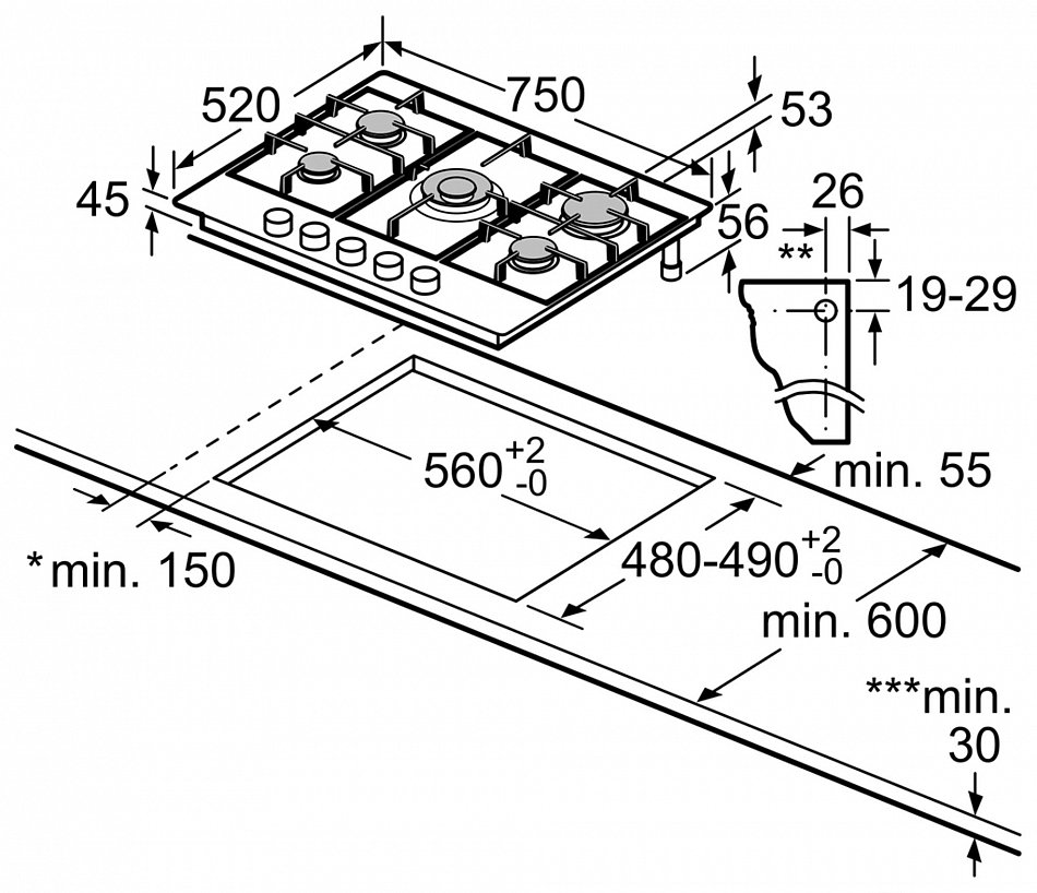 - Nischenmaße (HxBxT) (mm): 575-597 x 560 x 550