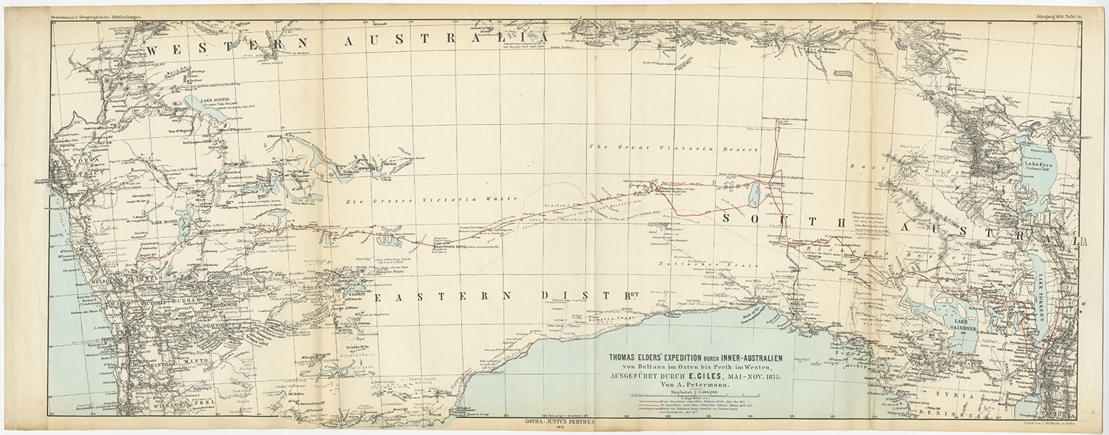 Antique Map of Australia from Beltana to Perth by Petermann (1876) $ 294.22 instead of Availability: in stock Condition : Good, general age-related toning. Some creasing and wear, please study image carefully. Date : 1876 Overall size : 69 x 27.5 cm. Image size : 65 x 25 cm. Description: Antique map titled 'Thomas Elders' Expedition durch Inner-Australien von Beltana im Osten bis Perth im Western ausgefuhrt durch E. Giles (..)'. Old map of Australia from Bunbury to Adelaide in the south, upper Murchison to north of Lake Eyre in the north. This map originates from Petermann's 'Geographische Mittheilungen'. Artists and Engravers: Lithograph by C. Helifarth in Gotha. |