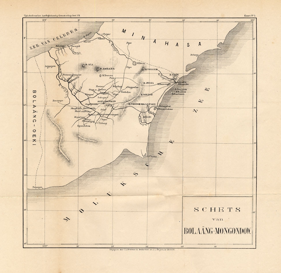 Antique Map of the Bolaang Mongondow District on Sulawesi by Stemler (c.1875) $ 73.56 Availability: in stock Condition : Good, general age related toning; some light staining from handling. Please study image carefully. Date : c.1875 Overall size : 39 x 38 cm. Image size : 30 x 29.5 cm. Description: Antique map titled 'Schets van Bolaang-Mongondow.' This map shows the Bolaang Mongondow district on the Indonesian island of Sulawesi. Originates from 'Tijdschrift Aardrijkskundig Genootschap', published by C. L. Brinkman in Amsterdam and J. L. Beijers in Utrecht, ca. 1875. Artists and Engravers: Map by C.L. Brinkman, Amsterdam and J.L. Beijers, Utrecht. |